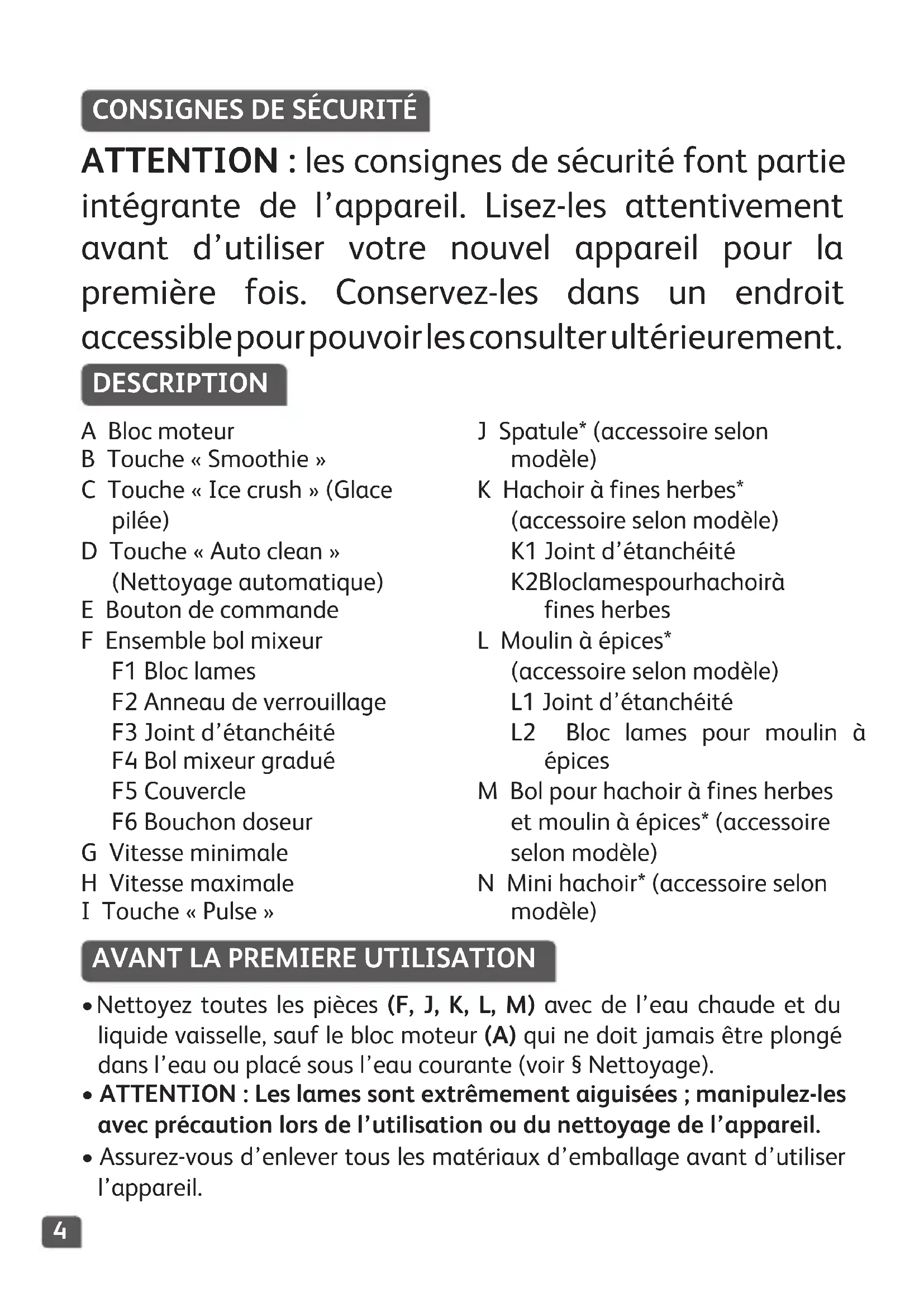 A Bloc moteur B Touche « Smoothie » C Touche « Ice crush » (Glace pilée) D Touche « Auto clean » (Nettoyage automatique) E Bouton de commande F Ensemble bol mixeur F1 Bloc lames F2 Anneau de verrouillage F3 Joint d’étanchéité F4 Bol mixeur gradué F5 Couvercle F6 Bouchon doseur G Vitesse minimale H Vitesse maximale I Touche « Pulse » J Spatule* (accessoire selon modèle) K Hachoir à fines herbes* (accessoire selon modèle) K1 Joint d’étanchéité K2 Bloc lames pour hachoir à fines herbes L Moulin à épices* (accessoire selon modèle) L1 Joint d’étanchéité L2 Bloc lames pour moulin à épices M Bol pour hachoir à fines herbes et moulin à épices* (accessoire selon modèle) N Mini hachoir* (accessoire selon modèle) ATTENTION : les consignes de sécurité font partie intégrante de l’appareil. Lisez-les attentivement avant d’utiliser votre nouvel appareil pour la première fois. Conservez-les dans un endroit accessible pour pouvoir les consulter ultérieurement.