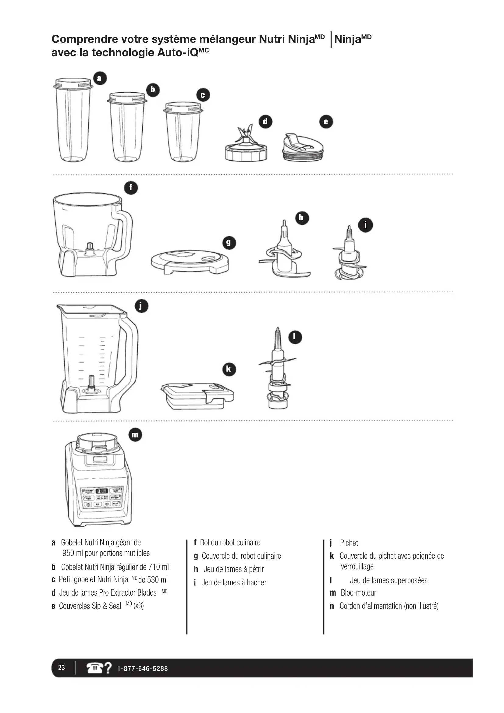 12 Veuillez éteindre l’appareil (position « Off ») et débrancher le cordon d’alimentation de la prise de courant lorsqu’il n’est pas utilisé et avant le nettoyage, l’assemblage ou le démontage des pièces. Pour débrancher l’appareil, tirez sur la fiche et retirez-la de la prise d’alimentation. Ne tirez jamais sur le cordon. 13 PRENEZ SOIN du cordon d’alimentation. Ne transportez jamais l’appareil en le tenant par le cordon. Ne débranchez jamais l’appareil de l’alimentation électrique en tirant sur le cordon. Pour débrancher l’appareil, tirez sur la fiche et retirez-la de la prise d’alimentation. 14 N’UTILISEZ PAS l’appareil si sa fiche ou son cordon est endommagé(e), s’il a fait défaut, s’il a été échappé ou endommagé. Retournez l’appareil à SharkNinja Operating LLC pour vérification, réparation ou réglage. 15 NE LAISSEZ PAS le cordon traîner sur le dessus d’une table ou d’un comptoir. Ne le laissez pas entrer en contact avec des surfaces chaudes, comme la cuisinière. 16 Posez toujours l’appareil sur une surface sèche et de niveau. 17 Afin de réduire le risque de blessures graves ou de dommages à l’appareil, gardez les mains, les cheveux, les vêtements et les ustensiles hors du récipient pendant l’utilisation. Vous pouvez utiliser une raclette, mais seulement lorsque le mélangeur est éteint. 18 Évitez le contact avec les pièces mobiles. 19 NE TENTEZ PAS d’affûter les lames. 20 N’UTILISEZ PAS l’appareil si l’ensemble de lames est tordu ou endommagé. 21 Pour réduire les risques de blessures, ne déposez jamais les jeux de lames sur la base sans fixer le pichet ou une tasse Nutri Ninja correctement. 22 N’UTILISEZ PAS cet appareil sur ou près des surfaces chaudes (telles qu’un brûleur à gaz ou électrique ou dans un four chauffé). 23 L’usage des attachements accessoires, y compris les pots de conserve, n’est pas recommandé par le fabricant du fait qu’il peut causer un incendie, une décharge électrique ou une blessure corporelle. 24 N’ENLEVEZ PAS le contenant du bloc-moteur pendant que l’appareil est en marche. 25 Afin de réduire le risque de blessure, N’UTILISEZ JAMAIS l’appareil sans le couvercle en place. N’ALLEZ PAS à l’encontre du mécanisme de verrouillage ; assurez-vous que l’attachement soit correctement monté avant d’utiliser l’appareil. 26 N’EXPOSEZ PAS les récipients aux changements de température extrêmes. 27 NE REMPLISSEZ PAS excessivement le récipient. 28 N’UTILISEZ PAS l’appareil lorsqu’il est vide. 29 Afin de réduire le risque de brûlures, permettez toujours à l’appareil de refroidir avant de retirer les pièces et le nettoyer. 30 Dans le cas d’une surcharge, les indicateurs du panneau de commande de l’appareil clignoteront et l’appareil arrêtera. Débranchez l’appareil et laissez- le refroidir pendant environ 15 minutes avant de l’utiliser de nouveau. 31 CE PRODUIT EST CONÇU POUR L’USAGE À DOMICILE SEULEMENT. N’utilisez pas l’appareil à d’autres fins que celles prévues. N’utilisez pas l’appareil à l’extérieur. 32 La notation maximale est basée sur le jeu de lames superposées (pichet) qui procure le plus de puissance. D’autres accessoires recommandés peuvent nécessiter significativement moins de puissance ou de courant. VEUILLEZ CONSERVER CES DIRECTIVES5 1-877-646-5288