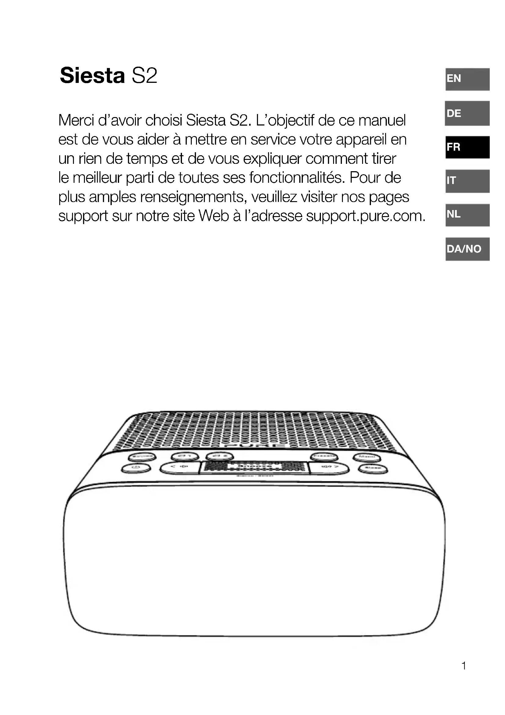 Siesta S2 Merci d’avoir choisi Siesta S2. L’objectif de ce manuel est de vous aider à mettre en service votre appareil en un rien de temps et de vous expliquer comment tirer le meilleur parti de toutes ses fonctionnalités. Pour de plus amples renseignements, veuillez visiter nos pages support sur notre site Web à l’adresse support.pure.com.2 Remarque : pour obtenir des informations concernant tous les autres symboles utilisés sur ce produit, téléchargez le guide utilisateur Siesta S2 à l’adresse support.pure.com.