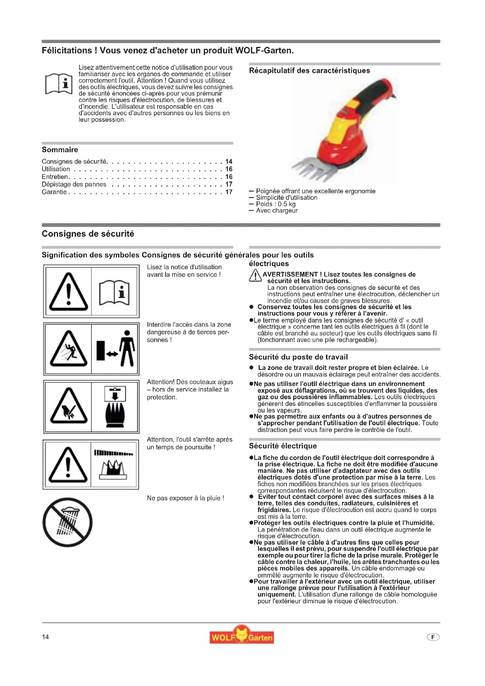 - Félicitations ! Vous venez d'acheter un produit WOLF-Garten. Sommaire Consignes de sécurité p. 14