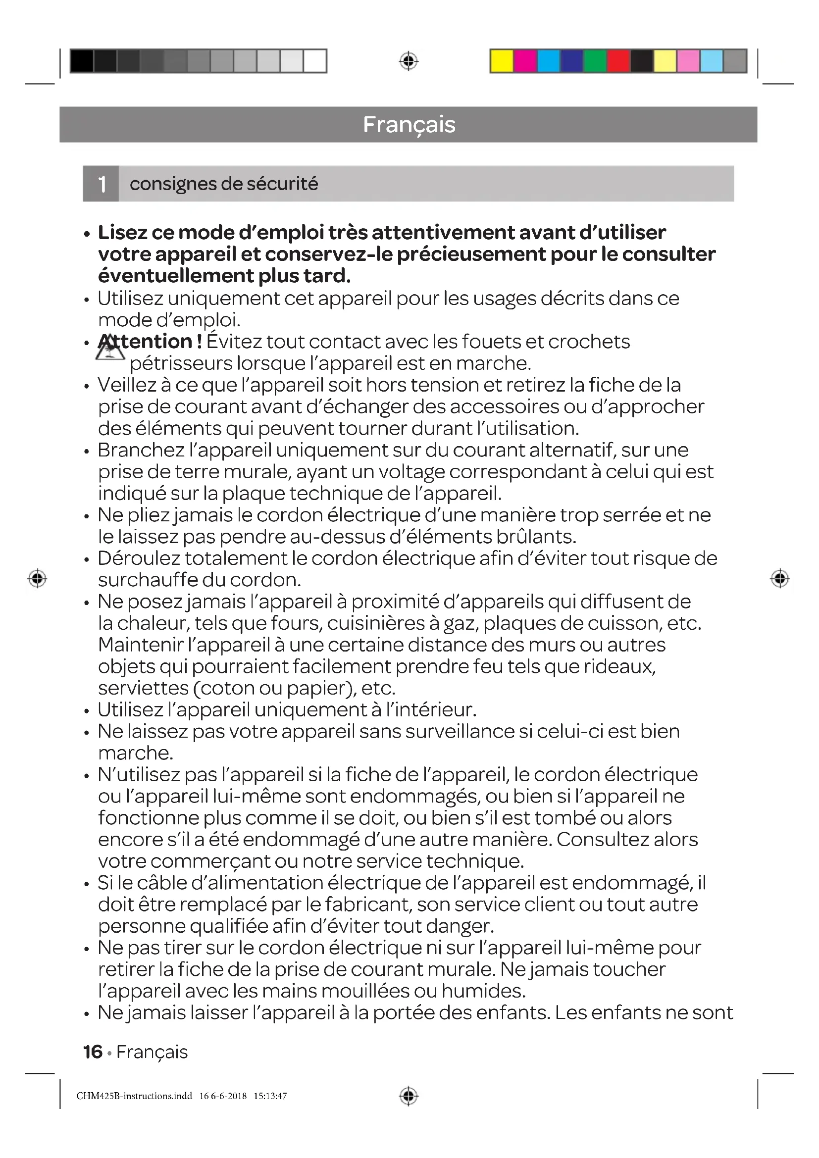 - Attention ! Évitez tout contact avec les fouets et crochets pétrisseurs lorsque l'appareil est en marche.