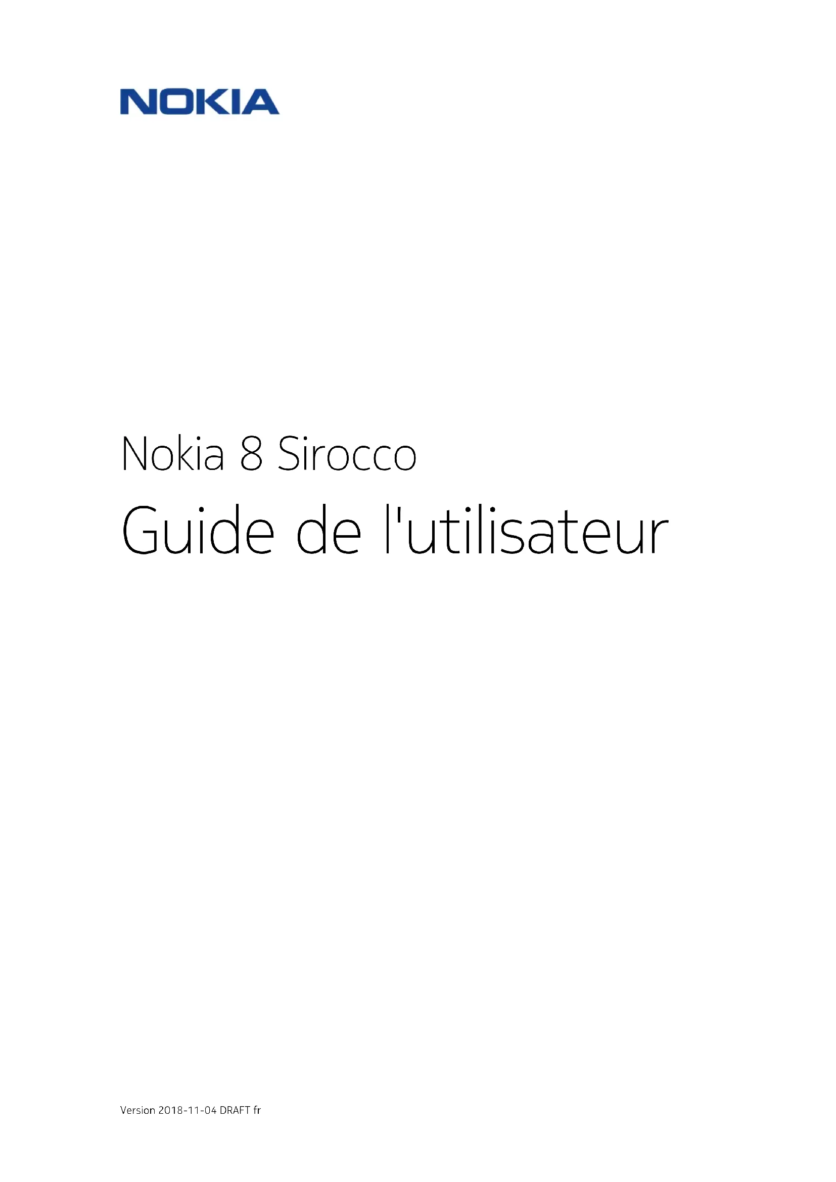 Nokia 8 Sirocco Guide de l'utilisateur Version 2018-11-04 DRAFT frÀ propos de ce guide d'utilisation Important : Pour obtenir des informations importantes sur la sécurité d'utilisation de votre appareil et de la batterie, consultez " Pour votre sécurité " et " Sécurité du produit " dans le guide d'utilisation imprimé ou sur www.nokia.com/support avant d'utiliser l'appareil. Pour découvrir comment commencer à utiliser votre nouvel appareil, consultez le guide d'utilisation imprimé. Nokia 8 Sirocco Guide de l'utilisateur © 2018 HMD Global Oy. Tous droits réservés. 2Sommaire À propos de ce guide d'utilisation 2 Prise en main 6 Gardez votre téléphone à jour 6 Touches et composants 6 Insérer ou retirer la carte SIM 8 Charger votre téléphone 9 Allumer et configurer votre téléphone 10 Configurer l'ID d'empreinte digitale 11 Verrouiller ou déverrouiller votre téléphone 11 Utiliser l'écran tactile 12 Fonctions de base 16 Personnaliser votre téléphone 16 Ouvrir et fermer une application 16 Notifications 17 Réglage du volume 19 Captures d'écran 20 Autonomie de la batterie 20 Réduire les frais d'itinérance de données 22 Écrire du texte 23 Heure et date 25 Horloge et réveil 26 Calculatrice 28 Accessibilité 28 Restez en contact avec votre famille et vos amis 30 Appels 30 Contacts 30 Envoyer et recevoir des messages 32 Mail 33 Réseaux sociaux 34 Appareil photo 35 Bases de l'appareil photo 35 Nokia 8 Sirocco Guide de l'utilisateur © 2018 HMD Global Oy. Tous droits réservés. 3Enregistrer une vidéo 36 Utiliser votre appareil photo comme un pro 37 Vos photos et vidéos 39 Internet et connexions 41 Activez le Wi-Fi 41 Utiliser une connexion de données mobiles 41 Naviguer sur le Web 42 Fermer une connexion 44 Bluetooth® 45 NFC 47 VPN 49 Musique et vidéos 51 Musique 51 Vidéos 52 Organiser votre journée 53 Agenda 53 Notes 54 Plans 55 Trouver des lieux et obtenir des itinéraires 55 Télécharger et mettre à jour des cartes 56 Utiliser les services de localisation 57 Applications et services 59 Google Play 59 Mises à jour du logiciel et sauvegardes 61 Mettez à jour le logiciel de votre téléphone 61 Sauvegarder vos données 61 Restaurer les paramètres d'origine et supprimer le contenu privé de votre téléphone
