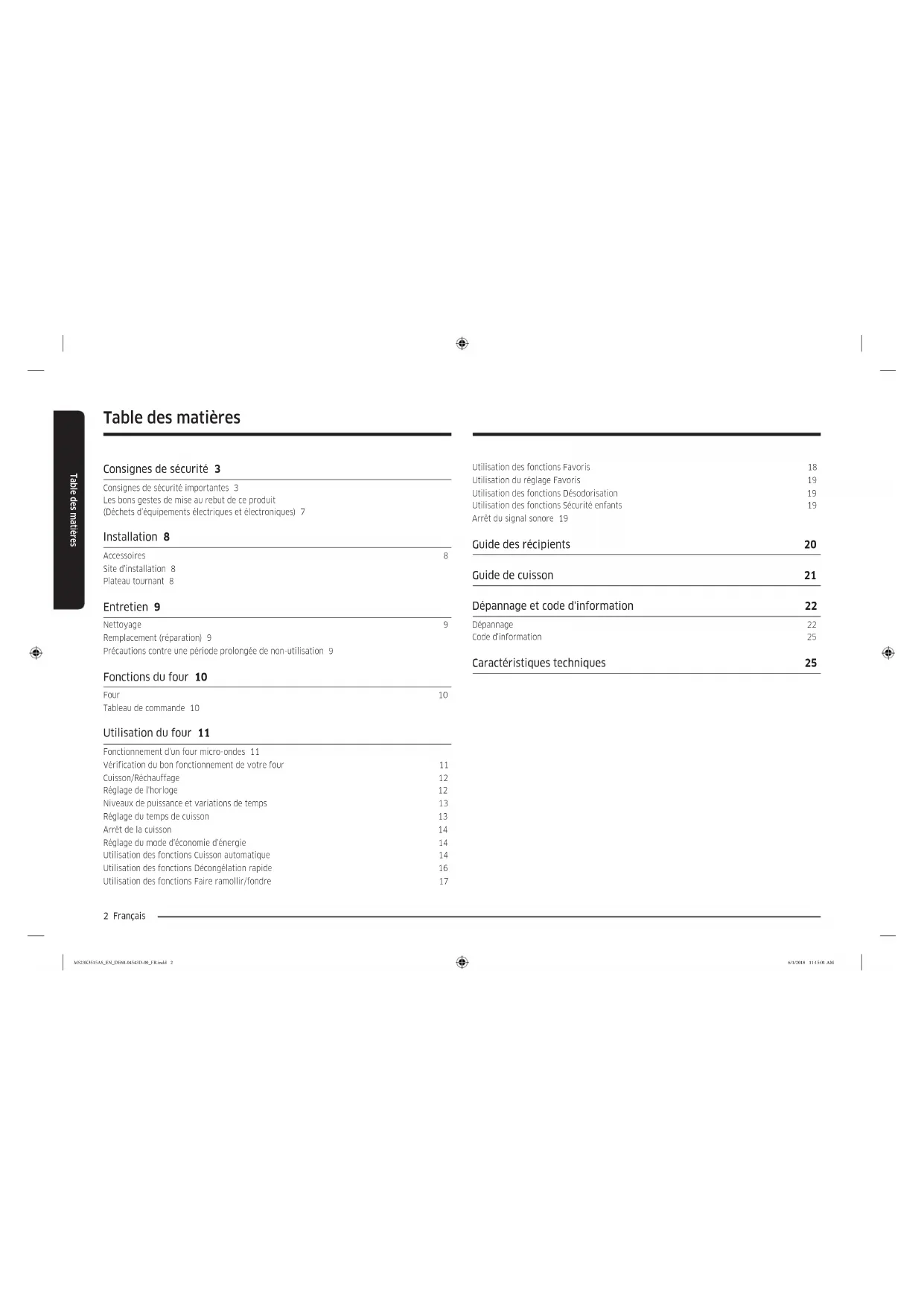 Four à micro-ondes Manuel d'utilisation MS23K3515** MS23K3515AS_EN_DE68-04543D-00_FR.indd 1 6/1/2018 11:15:01 AM2 Français Table des matières Table des matières Consignes de sécurité 3 Consignes de sécurité importantes 3 Les bons gestes de mise au rebut de ce produit (Déchets d’équipements électriques et électroniques) 7 Installation 8 Accessoires 8 Site d'installation 8 Plateau tournant 8 Entretien 9 Nettoyage 9 Remplacement (réparation) 9 Précautions contre une période prolongée de non-utilisation 9 Fonctions du four 10 Four 10 Tableau de commande 10 Utilisation du four 11 Fonctionnement d'un four micro-ondes 11 Vérification du bon fonctionnement de votre four 11 Cuisson/Réchauffage 12 Réglage de l'horloge 12 Niveaux de puissance et variations de temps 13 Réglage du temps de cuisson 13 Arrêt de la cuisson 14 Réglage du mode d'économie d'énergie 14 Utilisation des fonctions Cuisson automatique 14 Utilisation des fonctions Décongélation rapide 16 Utilisation des fonctions Faire ramollir/fondre 17 Utilisation des fonctions Favoris 18 Utilisation du réglage Favoris 19 Utilisation des fonctions Désodorisation 19 Utilisation des fonctions Sécurité enfants 19 Arrêt du signal sonore 19 Guide des récipients 20 Guide de cuisson 21 Dépannage et code d'information 22 Dépannage 22 Code d'information 25 Caractéristiques techniques 25 MS23K3515AS_EN_DE68-04543D-00_FR.indd 2 6/1/2018 11:15:01 AMFrançais 3 Consignes de sécurité Consignes de sécurité
