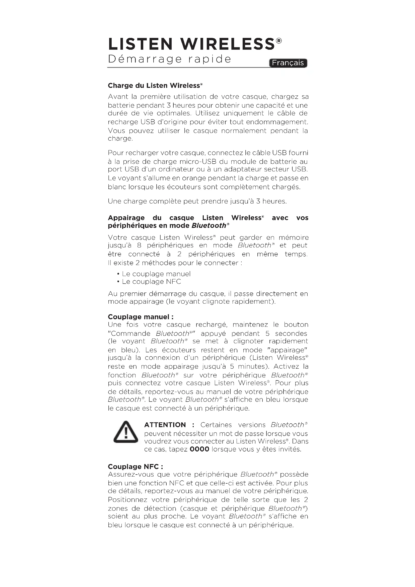 NFC Quick Start8 LISTEN WIRELESS® Démarrage rapide Charge du Listen Wireless® Avant la première utilisation de votre casque, chargez sa batterie pendant 3 heures pour obtenir une capacité et une durée de vie optimales. Utilisez uniquement le câble de recharge USB d’origine pour éviter tout endommagement. Vous pouvez utiliser le casque normalement pendant la charge. Pour recharger votre casque, connectez le câble USB fourni à la prise de charge micro-USB du module de batterie au port USB d’un ordinateur ou à un adaptateur secteur USB. Le voyant s’allume en orange pendant la charge et passe en blanc lorsque les écouteurs sont complètement chargés. Une charge complète peut prendre jusqu’à 3 heures. Appairage du casque Listen Wireless® avec vos périphériques en mode Bluetooth® Votre casque Listen Wireless® peut garder en mémoire jusqu’à 8 périphériques en mode Bluetooth® et peut être connecté à 2 périphériques en même temps. Il existe 2 méthodes pour le connecter :