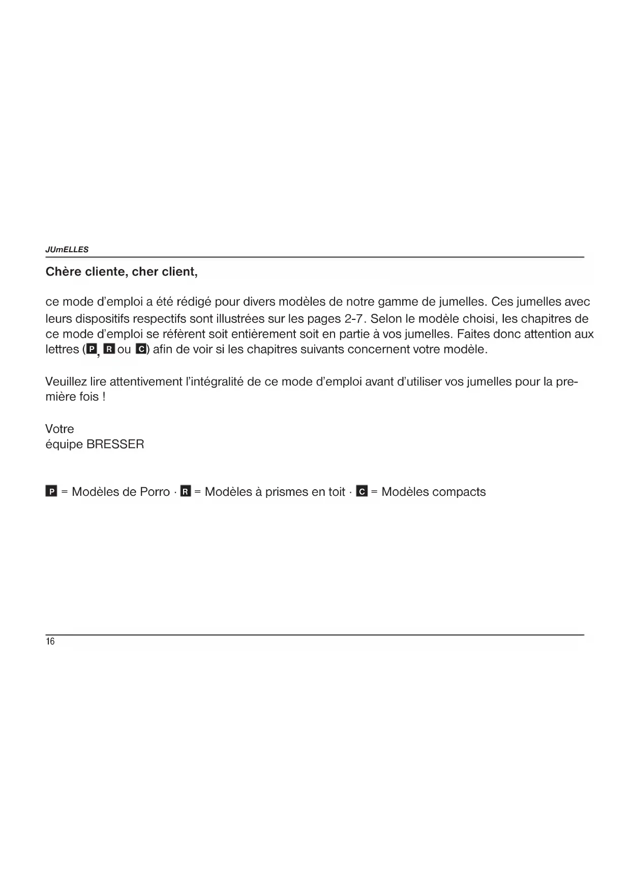) afin de voir si les chapitres suivants concernent votre modèle. Veuillez lire attentivement l’intégralité de ce mode d’emploi avant d’utiliser vos jumelles pour la pre- mière fois ! Votre équipe BRESSER