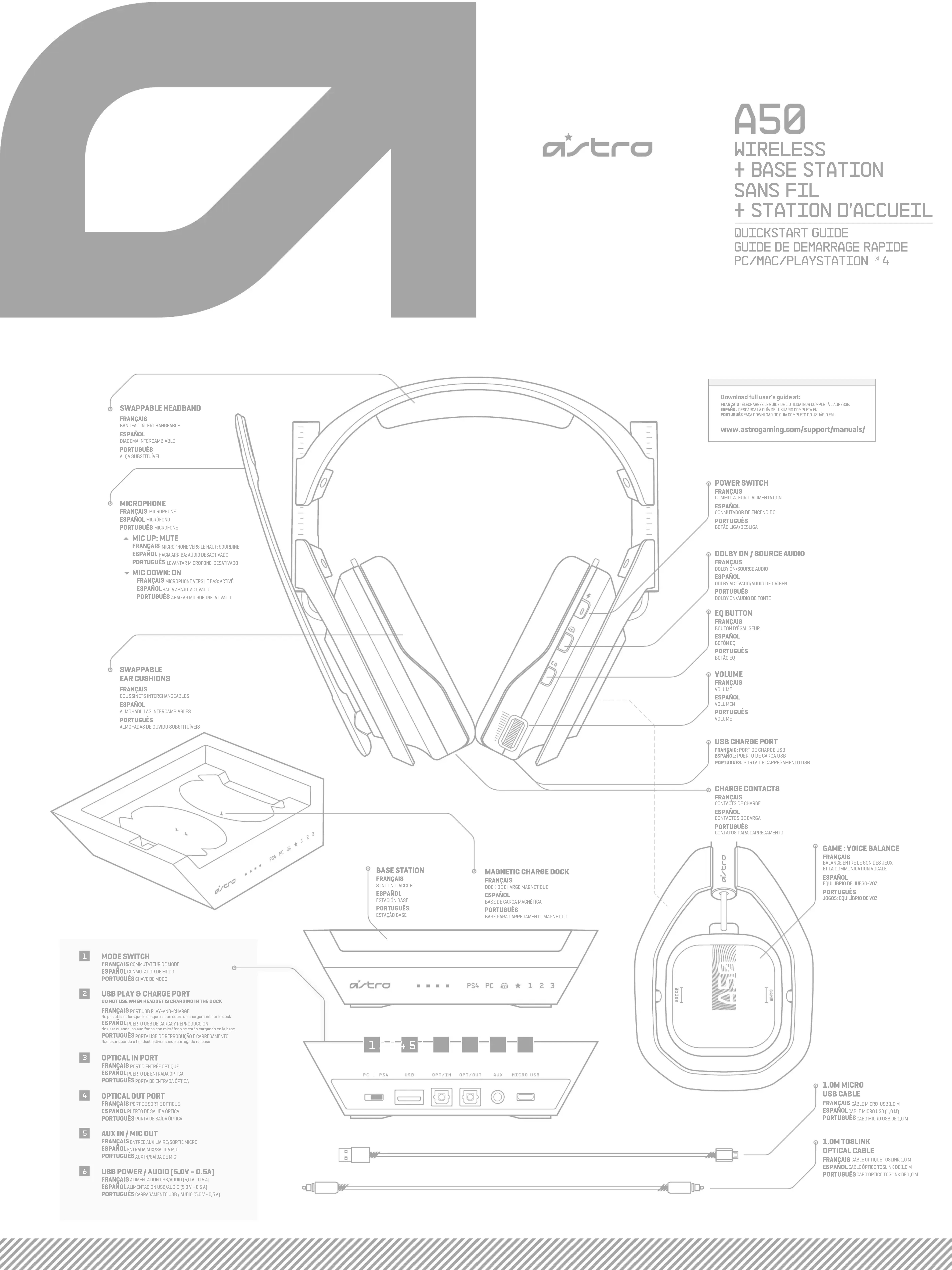 ENGLISH1. Ensure the Mode Switch on the Base Station is set to PC. 2. Plug the Micro end of the Micro USB cable into the Base Station and the USB end into your PC.3. PC: Navigate to your Playback Devices tab in your Sound settings on your PC.MAC: Navigate to your Settings, select Sound, then Output and choose Digital Out. Your Mac is ready at this point!4. Select ASTRO A50 Game, right click and set as Default Device.5. Select ASTRO A50 Voice, right click and set as Default Communication Device.6. Navigate to your ‘Recording Devices’ tab in your Sound settings on your PC.7. Select ASTRO A50 Voice, right click and set as Default Device & Default Communication Device.8. That’s it! Your A50 Wireless Headset and PC are set up and ready to game!FRANÇAIS1. Assurez-vous que le commutateur de mode de la station d'accueil est réglé sur PS4.2. Branchez l'extrémité micro du câble micro-USB dans la station d'accueil et l'extrémité USB dans la PlayStation 4.3. Branchez le câble optique TOSLink dans le port optique de la PS4 et branchez l'autre extrémité dans le port d'entrée optique de la station d'accueil.4. Votre casque sans fil A50 est déjà couplé à la station d'accueil. Cependant, vous devrez charger votre casque avant utilisation. Pour ce faire, utilisez les deux mains pour réinstaller le casque dans la station d'accueil.5. Une fois la station d'accueil connectée à la PS4, elle détectera automatiquement le dispositif USB.6. Dans le tableau de bord, accédez à "Paramètres" puis sélectionnez "Dispositifs", puis "Dispositifs audio".7. Assurez-vous que le dispositif d'entrée et le dispositif de sortie sont tous deux réglés sur Casque USB (Astro A50 Voice).8. Assurez-vous que l'option Sortie Casque est définie sur "Conversation audio".9. Revenez au menu Paramètres, puis sélectionnez "Son et écran".10. Accédez aux Paramètres de sortie audio, puis assurez-vous que le port de sortie principal est réglé sur Sortie numérique (optique) et que le format audio (Priorité) est réglé sur Bitstream (Dolby).11. Changez le dispositif d'entrée et de sortie sur Casque USB (Transmetteur ASTRO sans fil).12. Pour basculer sur un nouveau préréglage d'égaliseur, appuyez sur le bouton Égaliseur jusqu'à ce que le préréglage souhaité soit sélectionné.13. Vous avez terminé! Votre casque A50 sans fil et votre PS4 sont configurés et parés pour le jeu!ESPAÑOL1. El conmutador de modo de la estación base debe estar en la posición PS4.2. Conecta el extremo micro del cable micro USB a la estación base y el extremo USB a la PlayStation 4.3. Conecta el cable óptico TOSLink al puerto óptico PS4 y el otro extremo al puerto de entrada óptica de la estación base.4. Los audífonos con micrófono inalámbricos A50 vienen ya emparejados a la estación base. Pero debes cargarlos antes de usarlos por primera vez. Para ello, reposiciónalos en la estación base usando ambas manos.5. Cuando esté conectada a la PS4, la estación base se detectará automáticamente como dispositivo USB.