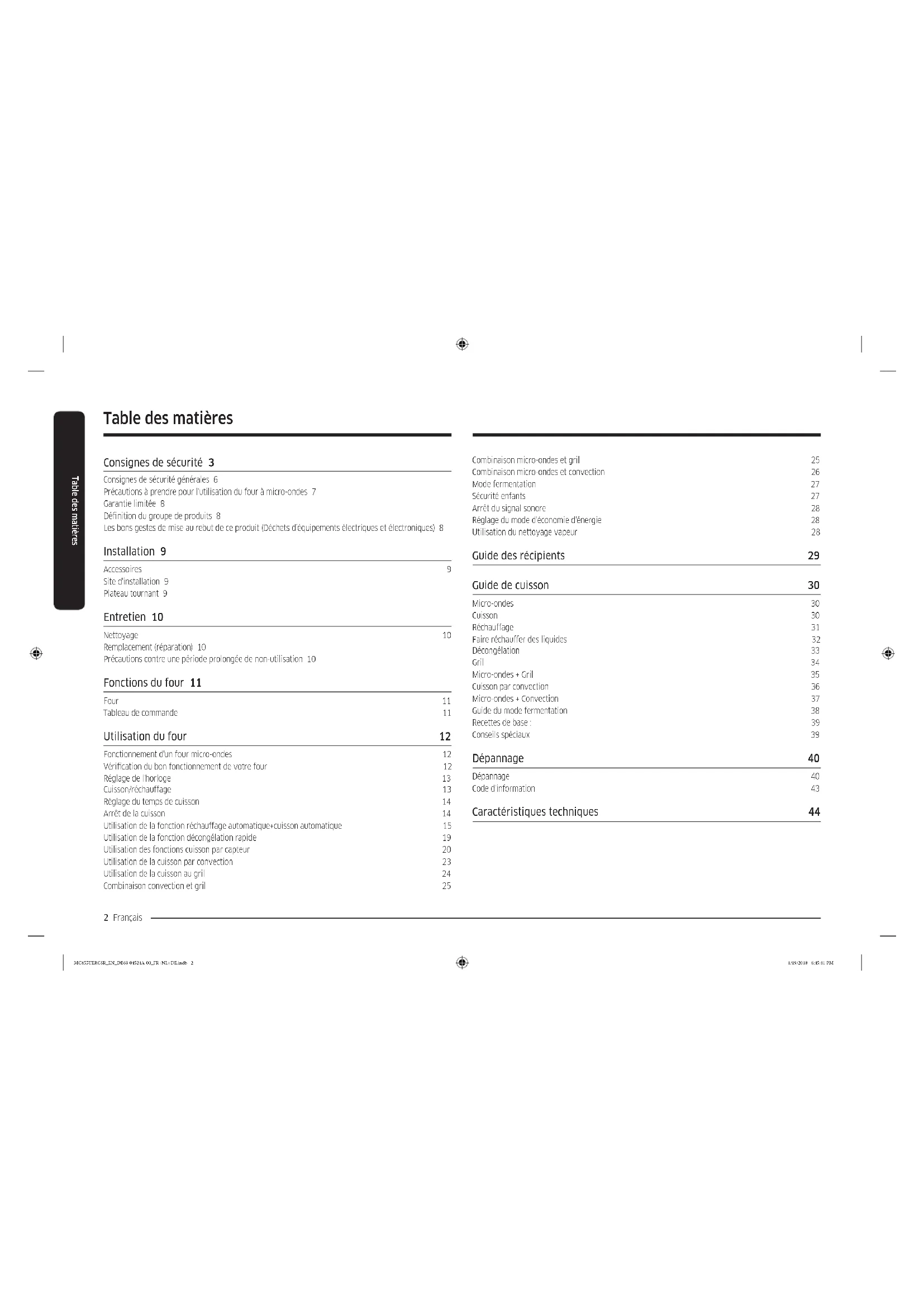 Four à micro-ondes Manuel d'utilisation MC455TERC** MC455TERCSR_EN_DE68-04524A-00_FR+NL+DE.indb 1 1/19/2018 6:45:41 PM2 Français Table des matières Table des matières Consignes de sécurité 3 Consignes de sécurité générales 6 Précautions à prendre pour l'utilisation du four à micro-ondes 7 Garantie limitée 8 Dénition du groupe de produits 8 Les bons gestes de mise au rebut de ce produit (Déchets d’équipements électriques et électroniques) 8 Installation 9 Accessoires 9 Site d'installation 9 Plateau tournant 9 Entretien 10 Nettoyage 10 Remplacement (réparation) 10 Précautions contre une période prolongée de non-utilisation 10 Fonctions du four 11 Four 11 Tableau de commande 11 Utilisation du four 12 Fonctionnement d'un four micro-ondes 12 Vérication du bon fonctionnement de votre four 12 Réglage de l'horloge 13 Cuisson/réchauffage 13 Réglage du temps de cuisson 14 Arrêt de la cuisson 14 Utilisation de la fonction réchauffage automatique+cuisson automatique 15 Utilisation de la fonction décongélation rapide 19 Utilisation des fonctions cuisson par capteur 20 Utilisation de la cuisson par convection 23 Utilisation de la cuisson au gril 24 Combinaison convection et gril 25 Combinaison micro-ondes et gril 25 Combinaison micro-ondes et convection 26 Mode fermentation 27 Sécurité enfants 27 Arrêt du signal sonore 28 Réglage du mode d'économie d'énergie 28 Utilisation du nettoyage vapeur 28 Guide des récipients 29 Guide de cuisson 30 Micro-ondes 30 Cuisson 30 Réchauffage 31 Faire réchauffer des liquides 32 Décongélation 33 Gril 34 Micro-ondes + Gril 35 Cuisson par convection 36 Micro-ondes + Convection 37 Guide du mode fermentation 38 Recettes de base : 39 Conseils spéciaux 39 Dépannage 40 Dépannage 40 Code d'information 43 Caractéristiques techniques 44 MC455TERCSR_EN_DE68-04524A-00_FR+NL+DE.indb 2 1/19/2018 6:45:41 PMFrançais 3 Consignes de sécurité Consignes de sécurité