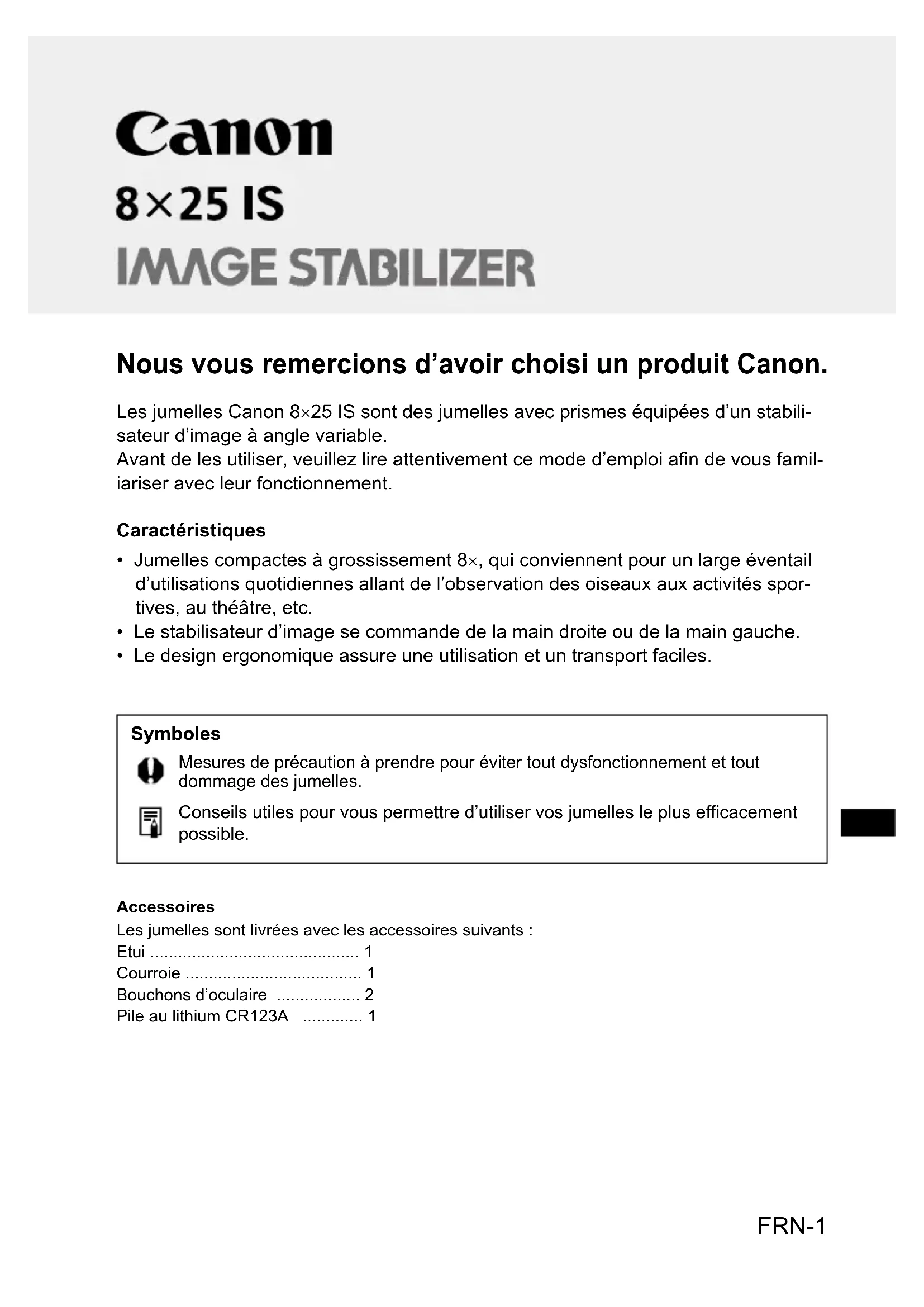 BINOCULARS Mode d’emploi FRNFRN-1 Nous vous remercions d’avoir choisi un produit Canon. Les jumelles Canon 8×25 IS sont des jumelles avec prismes équipées d’un stabili- sateur d’image à angle variable. Avant de les utiliser, veuillez lire attentivement ce mode d’emploi afin de vous famil- iariser avec leur fonctionnement. Caractéristiques