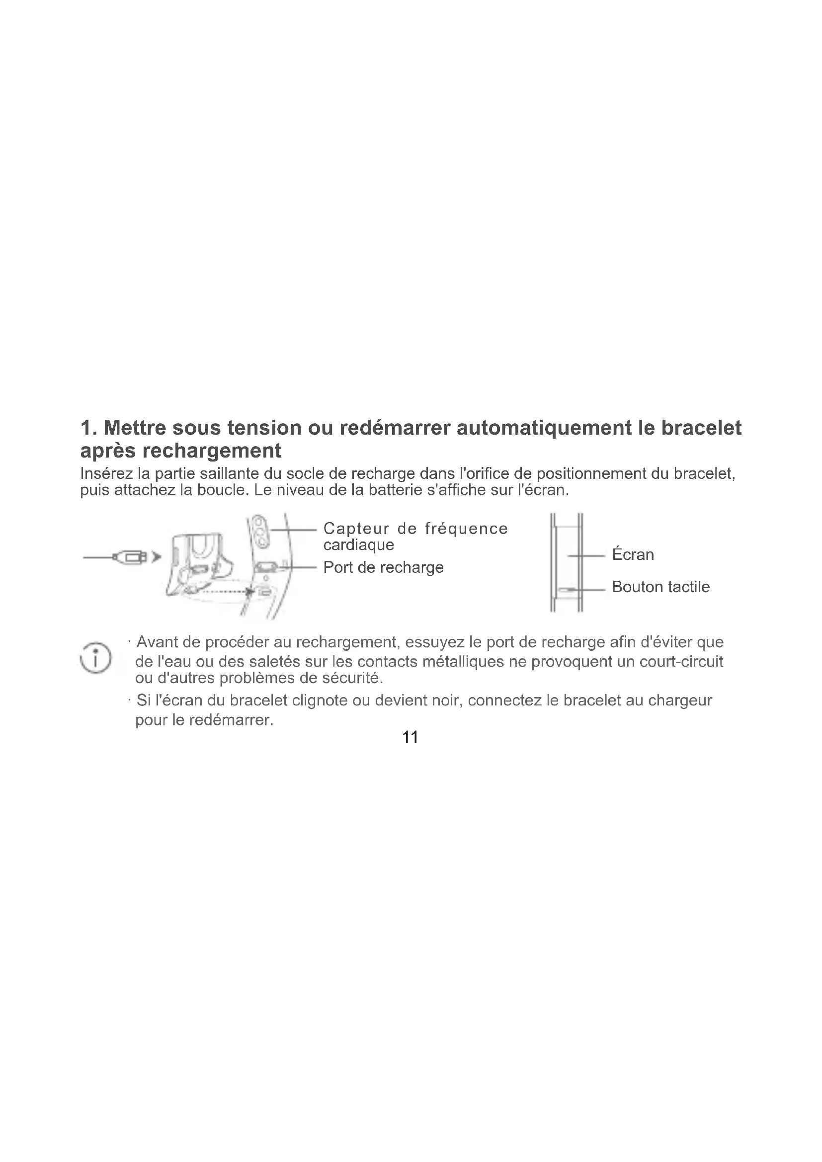 - Si l'écran du bracelet clignote ou devient noir, connectez le bracelet au chargeur pour le redémarrer. Capteur de fréquence cardiaque Bouton tactile Écran Port de recharge12