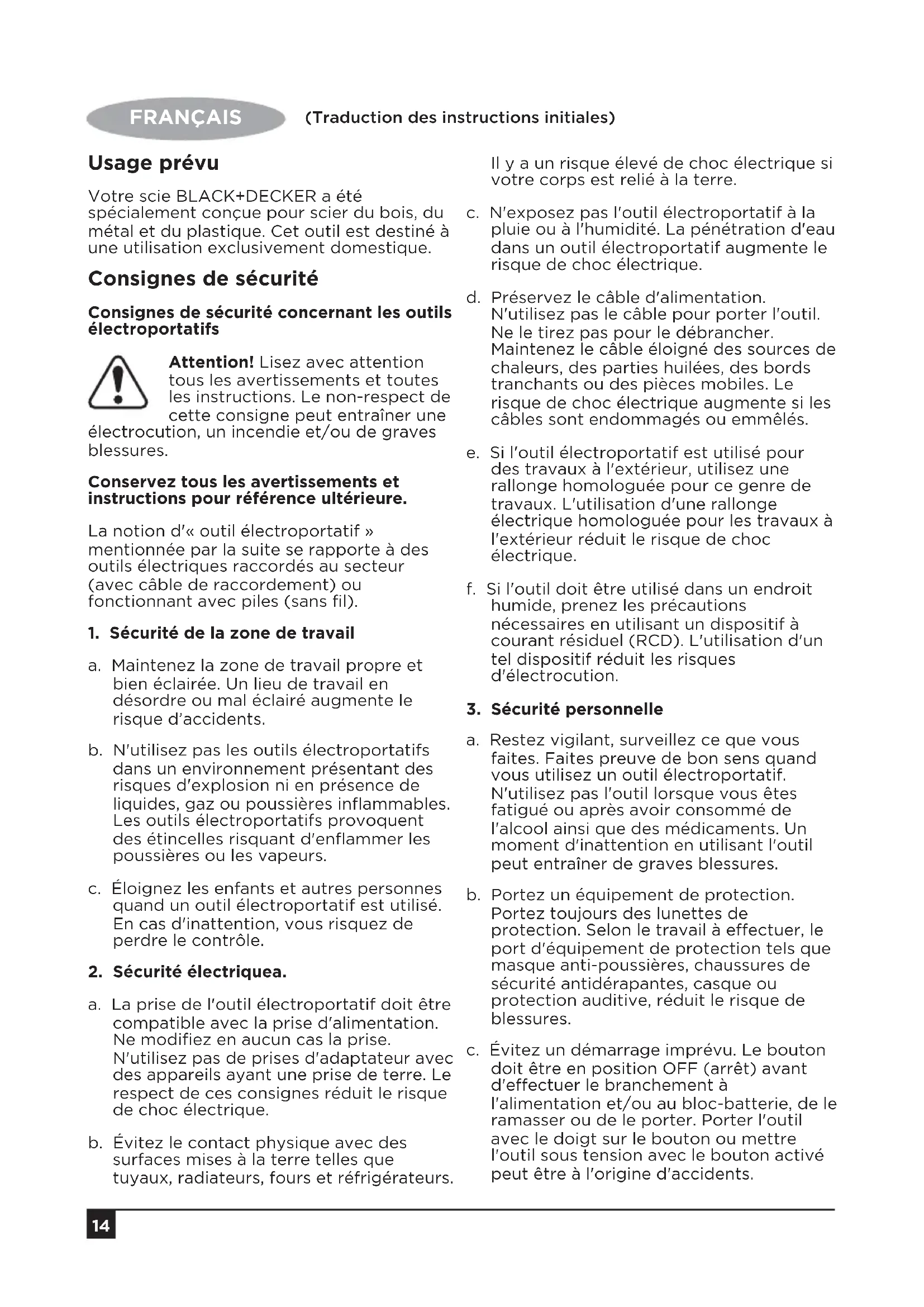 - Repairs have been attempted by persons other than authorised repair agents or Black + Decker service staff. To claim on the guarantee, you will need to submit proof of purchase to the seller or an authorised repair agent. You can check the location of your nearest authorised repair agent by contacting your local BLACK+DECKER office at the address indicated in this manual. Alternatively, a list of authorised BLACK+DECKER repair agents and full details of our aftersales service and contacts are available on the Internet at: www.2helpU.com14 FRANÇAIS (Traduction des instructions initiales) Usage prévu Votre scie BLACK+DECKER a été spécialement conçue pour scier du bois, du métal et du plastique. Cet outil est destiné à une utilisation exclusivement domestique. Consignes de sécurité Consignes de sécurité concernant les outils électroportatifs Attention! Lisez avec attention tous les avertissements et toutes les instructions. Le non-respect de cette consigne peut entraîner une électrocution, un incendie et/ou de graves blessures. Conservez tous les avertissements et instructions pour référence ultérieure. La notion d'« outil électroportatif » mentionnée par la suite se rapporte à des outils électriques raccordés au secteur (avec câble de raccordement) ou fonctionnant avec piles (sans fil).