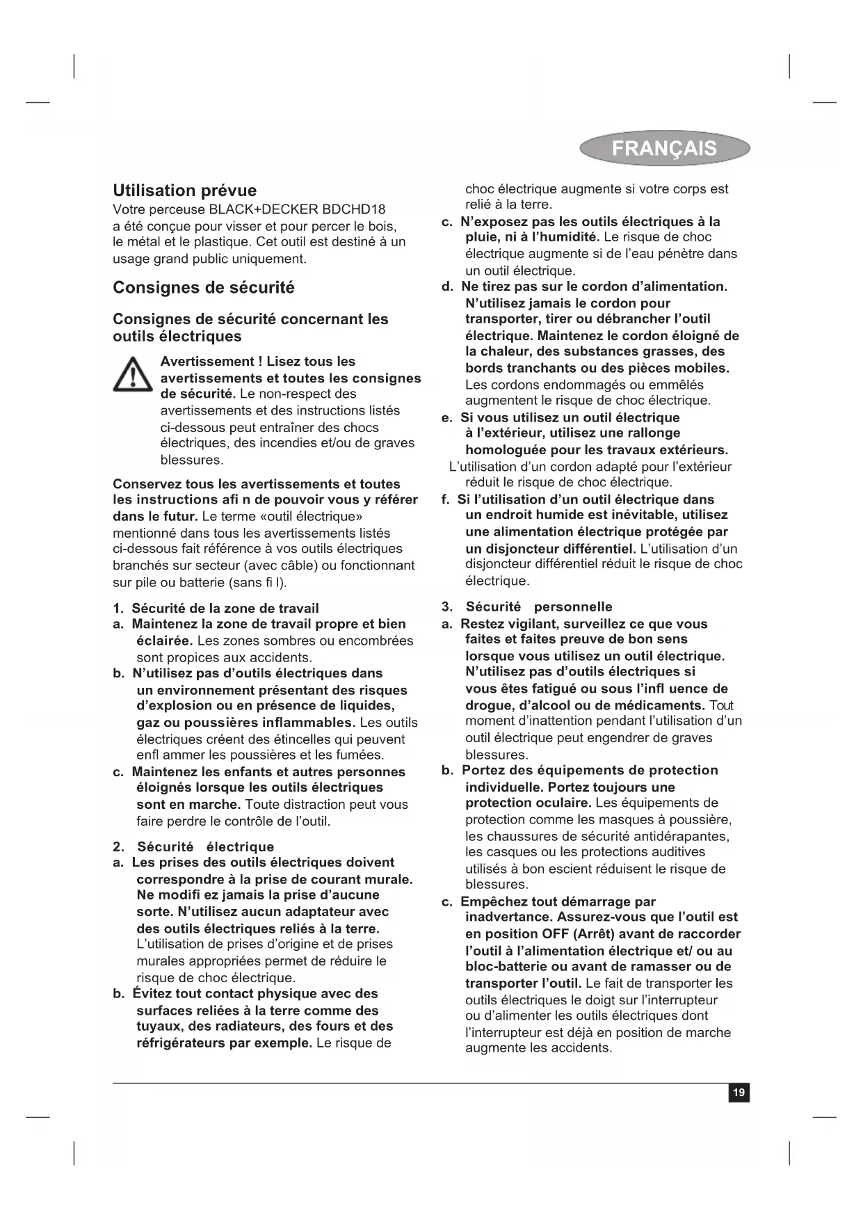 a. Faites réparer votre outil électrique par une personne qualifi ée, n’utilisant que des pièces de rechange d’origine. Cela permet de garantir la sûreté de l’outil électrique.21 FRANÇAIS Consignes de sécurité supplémentaires concernant les outils électriques Avertissement ! Instructions de sécurité supplémentaires concernant les perceuses ♦ Utilisez les poignées auxiliaires livrées avec l’outil. La perte de contrôle peut provoquer des blessures. ♦ Tenez l’outil électrique par ses surfaces de préhension isolées lorsque vous l’utilisez dans des endroits où l’accessoire de coupe peut entrer en contact avec des fi ls cachés. Tout contact de l’accessoire de coupe avec un fi l sous tension peut mettre les parties métalliques exposées de l’outil sous tension et provoquer un choc électrique à l’utilisateur. ♦ Tenez l’outil électrique par ses surfaces de préhension isolées lorsque vous l’utilisez dans des endroits où le dispositif de fi xation peut entrer en contact avec des fi ls cachés.. Tout contact du dispositif de fi xation avec un fi l sous tension peut mettre les parties métalliques exposées de l’outil sous tension et provoquer un choc électrique à l’utilisateur. ♦ Utilisez des pinces ou tout autre moyen pratique pour fi xer et soutenir la pièce à travailler sur une plateforme stable. Tenir la pièce à travailler dans vos mains ou contre votre corps la rend instable et peut conduire à une perte de contrôle. ♦ Avant de percer des murs, des planchers ou des plafonds, vérifi ez l’emplacement des fi ls électriques et des canalisations. ♦ Évitez de toucher le bout d’un foret juste après avoir percé. Il peut être chaud. ♦ L’utilisation prévue est décrite dans ce manuel d’utilisation. L’utilisation d’un accessoire ou d’une fi xation ou l’utilisation de cet outil à d’autres fi ns que celles recommandées dans ce manuel d’utilisation présentent un risque de blessures et/ou de dommages matériels. Sécurité des personnes ♦ Cet outil n’est pas conçu pour être utilisé par des personnes (y compris des enfants) ayant des capacités mentales, sensorielles ou physiques réduites, ou celles manquant d’expérience et de connaissances, à moins qu’elles ne soient encadrées ou qu’elles n’aient été formées à l’utilisation de l’appareil par une personne responsable de leur sécurité. ♦ Ne laissez jamais les enfants sans surveillance pour éviter qu’ils ne jouent avec cet appareil. Risques résiduels Certains risques résiduels autres que ceux mentionnés dans les avertissements sur la sécurité peuvent survenir en utilisant l’outil. Ces risques peuvent être provoqués par une utilisation incorrecte, prolongée, etc... Malgré l’application des normes de sécurité pertinentes et la présence de dispositifs de sécurité, certains risques résiduels ne peuvent pas être évités. Ils comprennent : ♦ Les blessures dues au contact avec une pièce rotative/ mobile. ♦ Les blessures dues au remplacement de pièces, lames ou accessoires. ♦ Les blessures dues à l’utilisation prolongée d’un outil. Lorsque l’outil est utilisé pendant de longues périodes, assurez-vous de faire des pauses régulières. ◆ La diminution de l’acuité auditive. ◆ Les risques sanitaires dus à l’inhalation de poussières émises pendant l’utilisation de l’outil (exemple : travail avec du bois, surtout le chêne, le hêtre et les panneaux en MDF). Vibrations La valeur des émissions de vibrations déclarée dans la section Caractéristiques techniques et la déclaration de conformité a été mesurée selon une méthode de test standard fournie par la norme EN 60745 et peut être utilisée pour comparer un outil à un autre. La valeur des émissions de vibrations déclarée peut aussi être utilisée pour une évaluation préliminaire à l’exposition. Avertissement ! En fonction de la manière dont l’outil est utilisé, la valeur des émissions de vibrations réelles pendant l’utilisation de l’outil peut différer de la valeur déclarée. Le niveau des vibrations peut dépasser le niveau déclaré. Quand l’exposition aux vibrations est évaluée afi n de déterminer les mesures de sécurité requises par la norme 2002/44/ CE pour protéger les personnes utilisant régulièrement des outils électriques, cette estimation doit tenir compte des conditions réelles d’utilisation et de la façon dont l’outil est utilisé. Il faut également tenir compte de toutes les composantes du cycle de fonctionnement comme la durée pendant laquelle22 FRANÇAIS l’outil est arrêté et quand il fonctionne au ralenti, ainsi que la durée du déclenchement. Étiquettes sur l’outil Outre le code date, les symboles suivants sont apposés sur l’outil : Avertissement ! Pour réduire le risque de blessures, l’utilisateur doit lire le manuel d’instructions. Consignes de sécurité supplémentaires concernant les batteries/piles et les chargeurs (non fournis avec l’outil) Batteries ♦ Ne tentez jamais sous aucun prétexte de les ouvrir. ♦ N’exposez pas les batteries/piles à l’eau. ♦ Ne les stockez pas dans des endroits où la température peut dépasser 40° C. ♦ Ne les rechargez qu’à une température ambiante comprise entre 10° C et 40° C. ♦ Ne les rechargez qu’à l’aide du chargeur fourni avec l’outil. ♦ Pour la mise au rebut des batteries/piles, respectez les instructions mentionnées à la section « Protection de l’environnement ». N‘essayez pas de recharger des batteries endommagées. Chargeurs ♦ N’utilisez votre chargeur BLACK+DECKER que pour recharger la batterie fournie avec l’outil. D’autres batteries pourraient exploser et provoquer des blessures et des dommages. ♦ Ne tentez jamais de recharger des piles non rechargeables. ♦ Faites immédiatement remplacer les cordons endommagés. ♦ N’exposez pas le chargeur à l