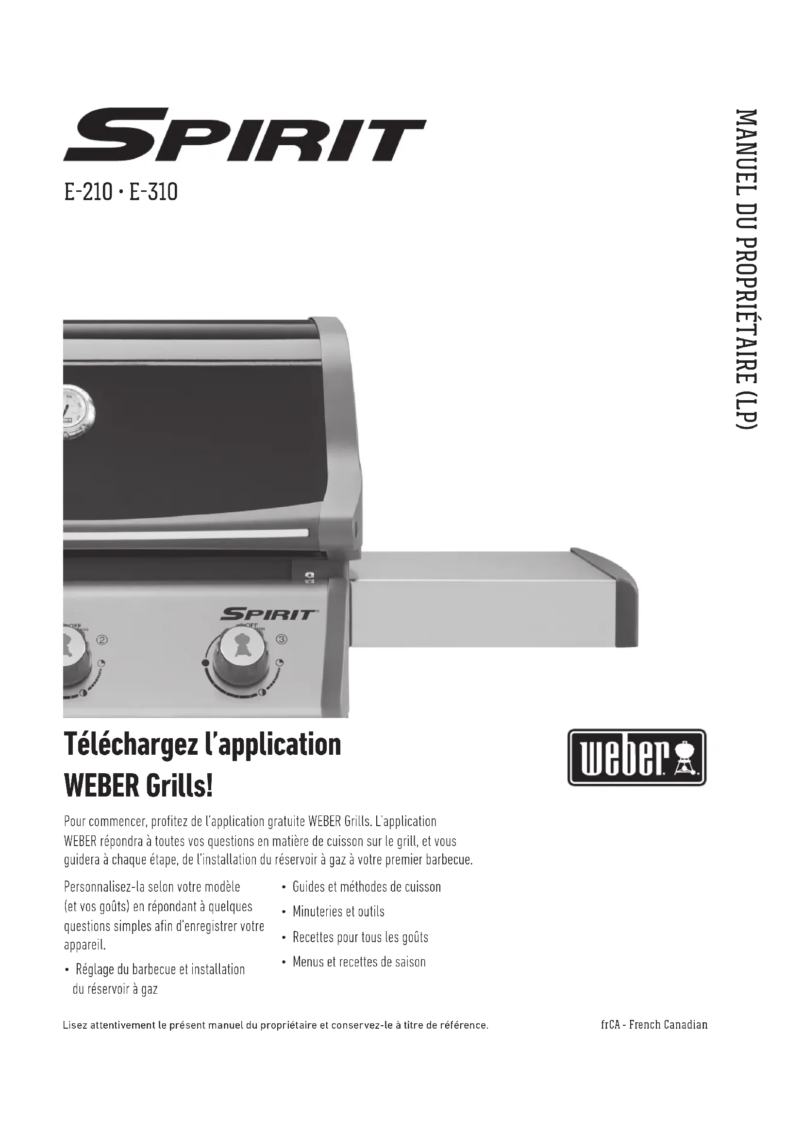 38 Bienvenue dans la famille WEBER Consignes de sécurité importantes 40 La promesse WEBER Garantie 41 Caractéristiques del’appareil Caractéristiques du SPIRIT42 Trucs et astuces La cuisson directe ou indirecte Les pratiques du barbecue44 Pour commencer Renseignements importants sur les branchements de propane liquide et de gaz Installation du réservoir de propane liquide et vérification des fuites Remplissage ou remplacement d’un réservoir de propane liquide48 Fonctionnement Première utilisation de votre barbecue À chaque utilisation de votre barbecue Allumage du barbecue50 Entretien de l’appareil Nettoyage et entretien52 Dépannage54 Guide de cuisson55 Pièces de remplacement Bonjour et bienvenue au sein de la famille WEBER! Veuillez vous assurer de lire le présent Guide d’utilisation et de télécharger l’application gratuite WEBERGrills afin de commencer à cuisiner le plus rapidement possible. L’application WEBERGrills est la solution pour maîtriser l’art du barbecue. Qu’il s’agisse de l’installation du réservoir à gaz, de recettes ou de fonctionnalités personnalisables, l’application est l’endroit où vous entamerez votre exploration du monde desgrillades – et ne voudrez plus en ressortir. Nous vous remercions d’avoir choisi WEBER.40 La promesse WEBER