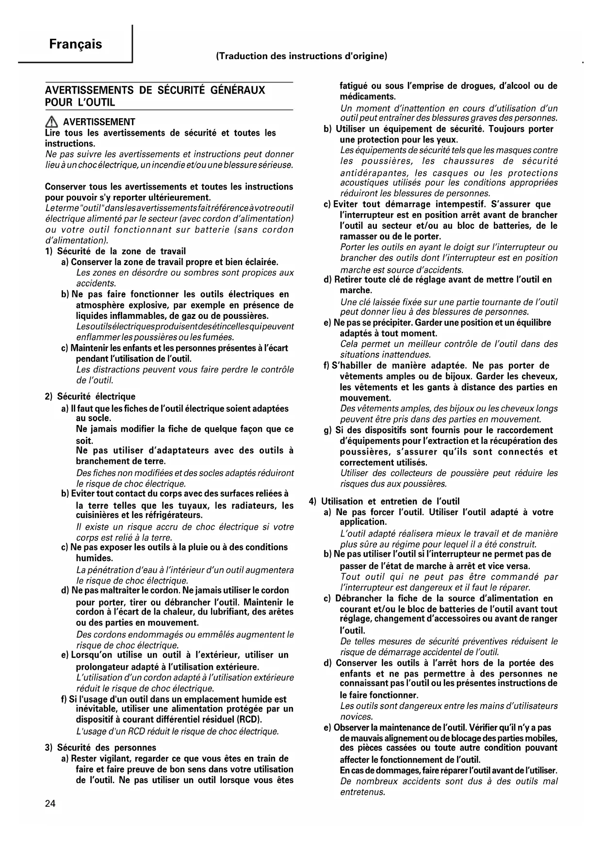 AVERTISSEMENT Lire tous les avertissements de sécurité et toutes les instructions. Ne pas suivre les avertissements et instructions peut donner lieu à un choc électrique, un incendie et/ou une blessure sérieuse. Conserver tous les avertissements et toutes les instructions pour pouvoir s'y reporter ultérieurement. Le terme "outil" dans les avertissements fait référence à votre outil électrique alimenté par le secteur (avec cordon d’alimentation) ou votre outil fonctionnant sur batterie (sans cordon d’alimentation).
