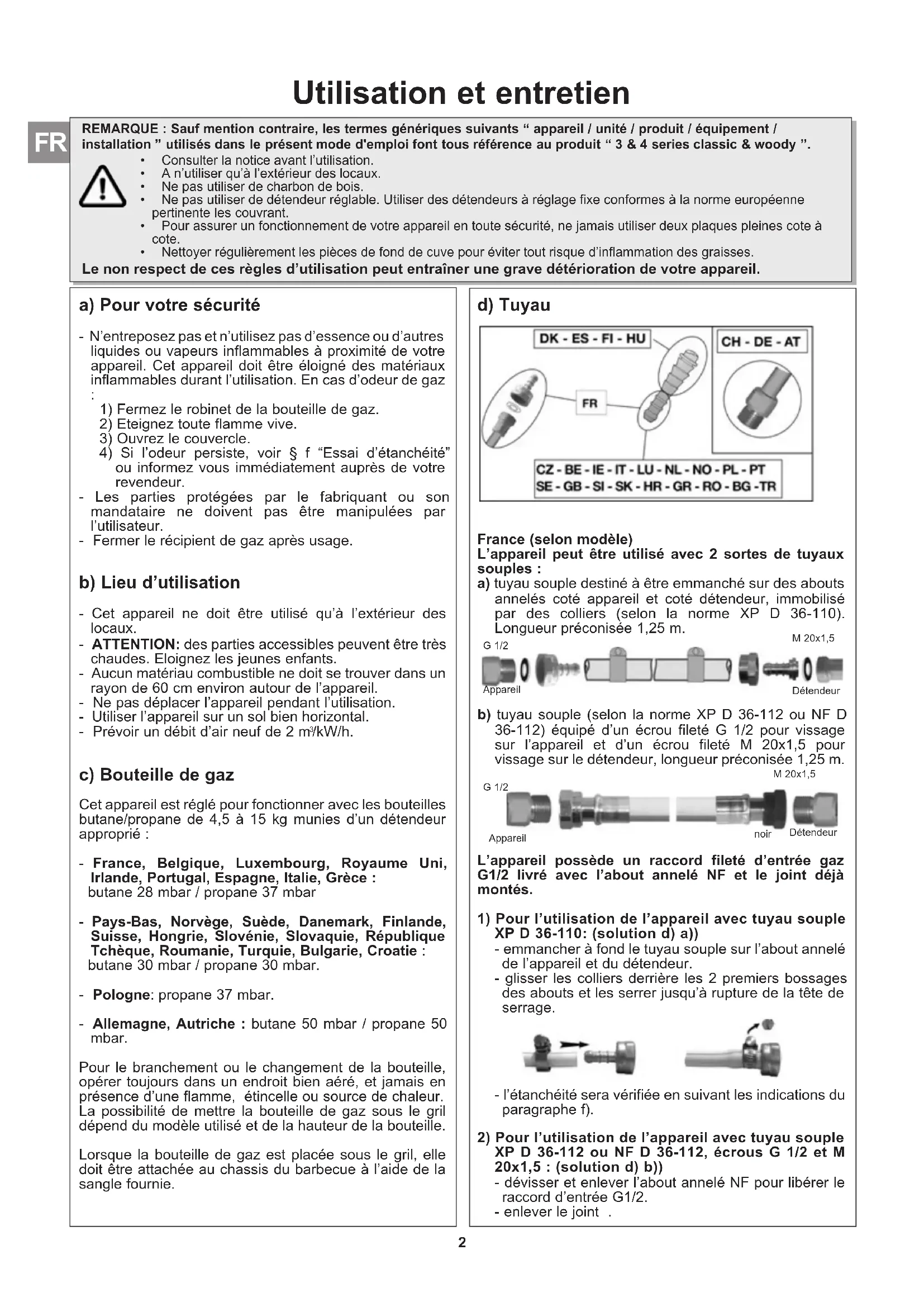 /kW/h. c) Bouteille de gaz Cet appareil est réglé pour fonctionner avec les bouteilles butane/propane de 4,5 à 15 kg munies d’un détendeur approprié : - France, Belgique, Luxembourg, Royaume Uni, Irlande, Portugal, Espagne, Italie, Grèce : butane 28 mbar / propane 37 mbar - Pays-Bas, Norvège, Suède, Danemark, Finlande, Suisse, Hongrie, Slovénie, Slovaquie, République Tchèque, Roumanie, Turquie, Bulgarie, Croatie : butane 30 mbar / propane 30 mbar. - Pologne: propane 37 mbar. - Allemagne, Autriche : butane 50 mbar / propane 50 mbar. Pour le branchement ou le changement de la bouteille, opérer toujours dans un endroit bien aéré, et jamais en présence d’une flamme, étincelle ou source de chaleur. La possibilité de mettre la bouteille de gaz sous le gril dépend du modèle utilisé et de la hauteur de la bouteille. Lorsque la bouteille de gaz est placée sous le gril, elle doit être attachée au chassis du barbecue à l’aide de la sangle fournie.