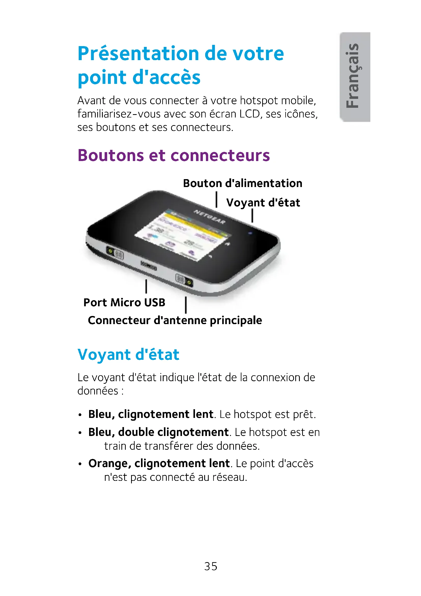 - Orange, clignotement lent. Le point d'accès n'est pas connecté au réseau. Port Micro USB Connecteur d'antenne principale Bouton d'alimentation Voyant d'état Français36 Bouton d'alimentation Appuyez sur le bouton d’alimentation et maintenez-le enfoncé pendant deux secondes pour allumer le point d’accès ou pendant cinq secondes pour l’éteindre. Appuyez puis relâchez le bouton d’alimentation pour faire défiler les écrans LCD. Bouton d'alimentation Ecran LCD Vous pouvez utiliser les icônes de l'écran tactile ainsi que ses autres éléments pour acher l'état du hotspot mobile, configurer les paramètres de la bande WiFi, consulter les détails sur la consommation de données et acher les alertes système.37 Icône Description Puissance du signal 5 barres. Excellente. 1 barre. Faible. Type de réseau 4G+. Un réseau LTE Advanced avec agrégation opérateur est disponible. 4G. Un réseau LTE est disponible. H+. DC-HSPA+ HSPA+/DC HSPA. H. HSPA. 3G. UMTS. Trafic Contours seuls. Connecté. Flèche pleine. Envoi/réception de données. Aucun achage. Pas de connexion. Niveau de charge de la batterie Pourcentage de charge de batterie restante. Configuration de votre point d'accès Avant de vous connecter à votre hotspot mobile, vous devez insérer une carte Micro SIM (3FF), installer la batterie, allumer le hotspot mobile et recharger la batterie. Remarque : pour vous procurer une carte Micro SIM, contactez votre fournisseur d’accès Internet.38 ¾ Pour insérer la carte Micro SIM :