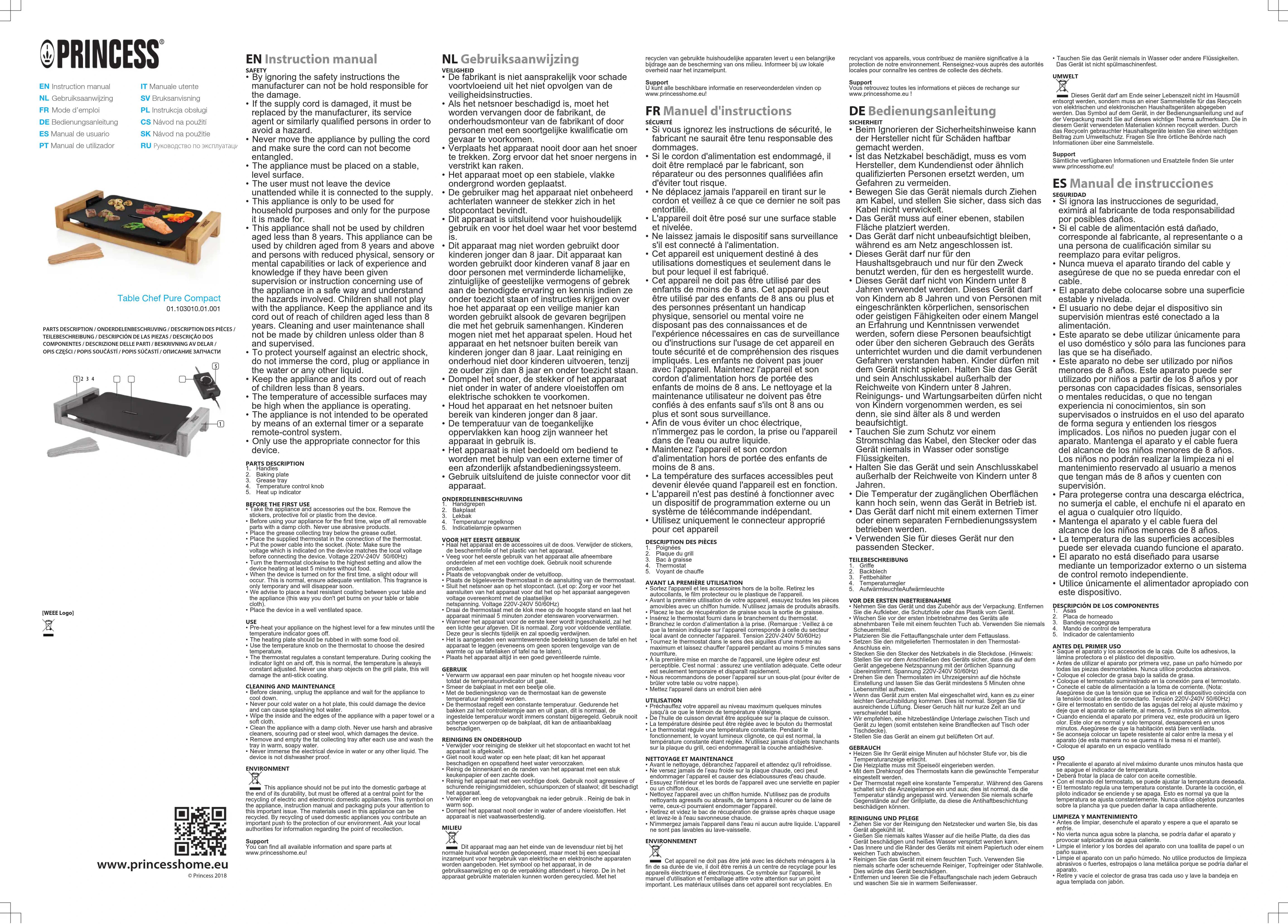 - N'immergez jamais l'appareil dans l'eau ni aucun autre liquide. L'appareil ne sont pas lavables au lave-vaisselle. ENVIRONNEMENT Cet appareil ne doit pas être jeté avec les déchets ménagers à la fin de sa durée de vie, il doit être remis à un centre de recyclage pour les appareils électriques et électroniques. Ce symbole sur l'appareil, le manuel d'utilisation et l'emballage attire votre attention sur un point important. Les matériaux utilisés dans cet appareil sont recyclables. En recyclant vos appareils, vous contribuez de manière significative à la protection de notre environnement. Renseignez-vous auprès des autorités locales pour connaître les centres de collecte des déchets. Support Vous retrouvez toutes les informations et pièces de rechange sur www.princesshome.eu! DEBedienungsanleitung SICHERHEIT