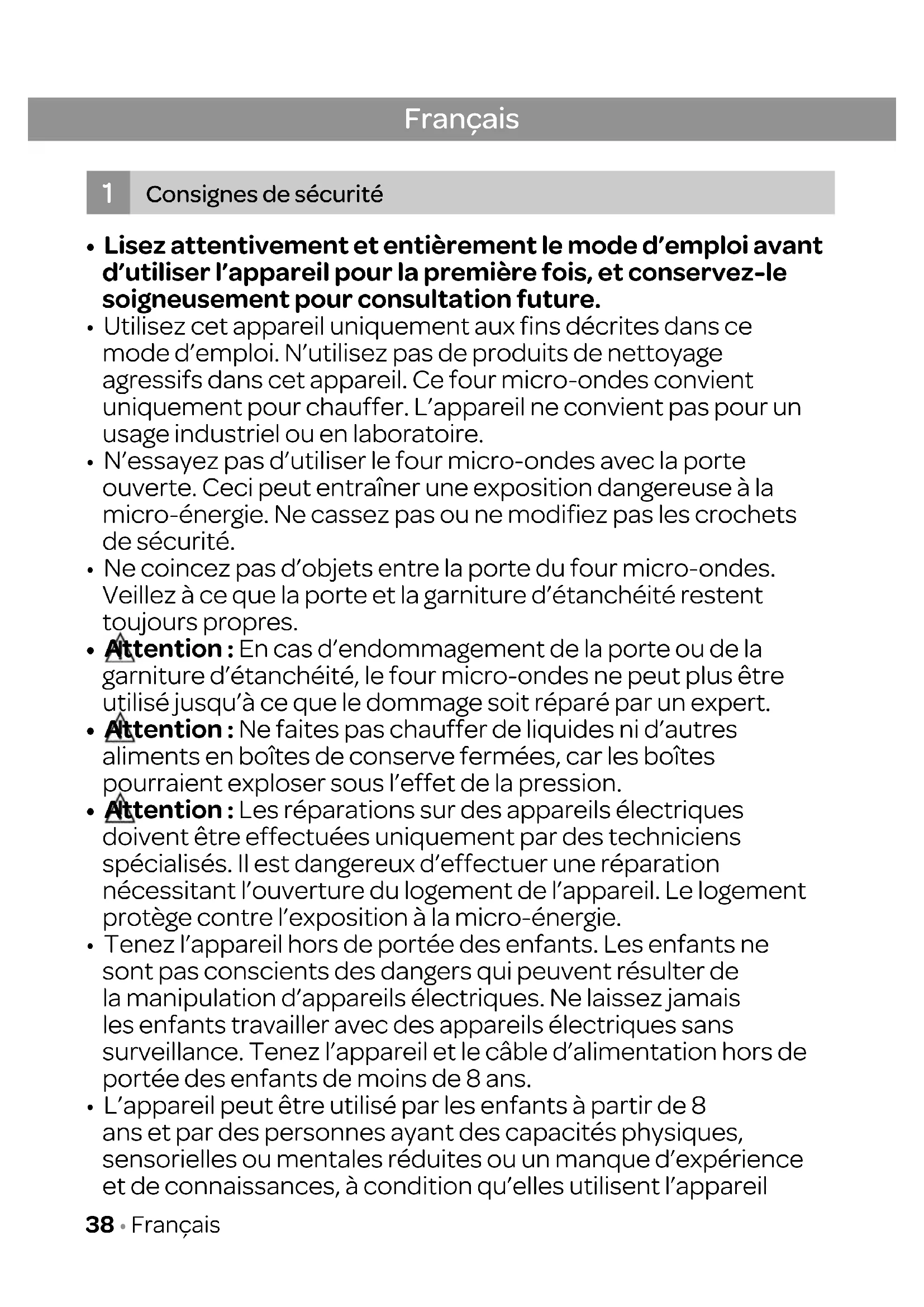- Utilisez cet apparéil uniquement aux fins décrites dans ce mode d'emploi. N'utilisez pas de produits de nettoyage agressifs dans cet apparéil. Ce four micro-ondes convient uniquement pour chauffer. L' apparéil ne convient pas pour un usage industriel ou en laboratoire.
