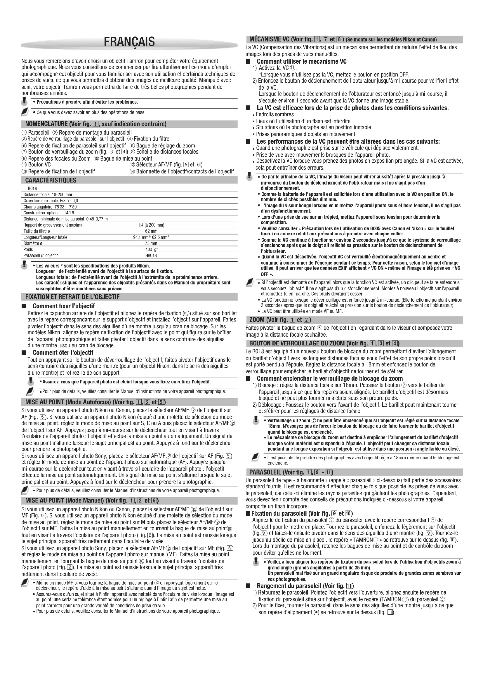 - Précautions à prendre an d’éviter les problèmes.• Ce que vous devez savoir en plus des opérations de base. NOMENCLATURE (Voir g. , sauf indication contraire) ① Parasoleil ② Repère de montage du parasoleil③ Repère de verrouillage du parasoleil sur l’objectif ④ Fixation du ltre ⑤ Repère de xation de parasoleil sur l’objectif ⑥ Bague de réglage du zoom ⑦ Bouton de verrouillage du zoom (g. et ) ⑧ Échelle de distances focales ⑨ Repère des focales du Zoom ⑩ Bague de mise au point ⑪ Bouton VC ⑫ Sélecteur AF/MF (g. et ) ⑬ Repère de xation de l’objectif ⑭ Baïonnette de l’objectif/contacts de l’objectif CARACTÉRISTIQUES B018 Distance focale 18-200 mm Ouverture maximale F/3,5 - 6,3 Champ angulaire 75˚33' - 7˚59' Construction optique 14/16 Distance minimale de mise au point 0,49-0,77 m Rapport de grossissement maximal 1:4 (à 200mm) Taille du ltre ø 62 mm Longueur/Longueur totale 94,1 mm/102,5 mm* Diamètre ø 75 mm Poids 400 g* Parasoleil d' objectif HB018 Les valeurs * sont les spécications des produits Nikon. Longueur: de l’extrémité avant de l’objectif à la surface de xation. Longueur totale: de l’extrémité avant de l’objectif à l’extrémité de la proéminence arrière. Les caractéristiques et l’apparence des objectifs présentés dans ce Manuel du propriétaire sont susceptibles d’être modiées sans préavis.