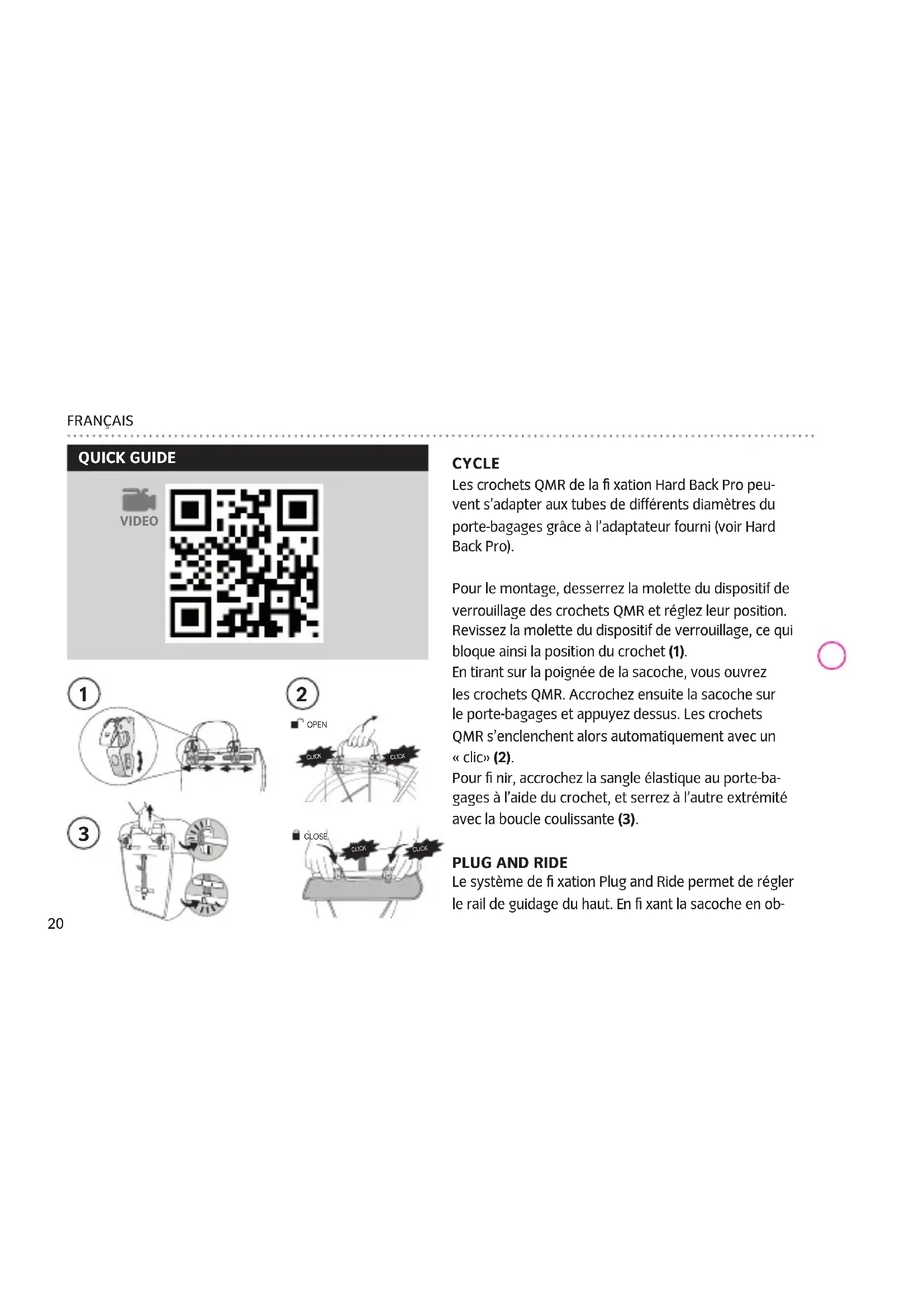 Le système de fi xation Plug and Ride permet de régler le rail de guidage du haut. En fi xant la sacoche en ob- VIDEO QUICK GUIDE