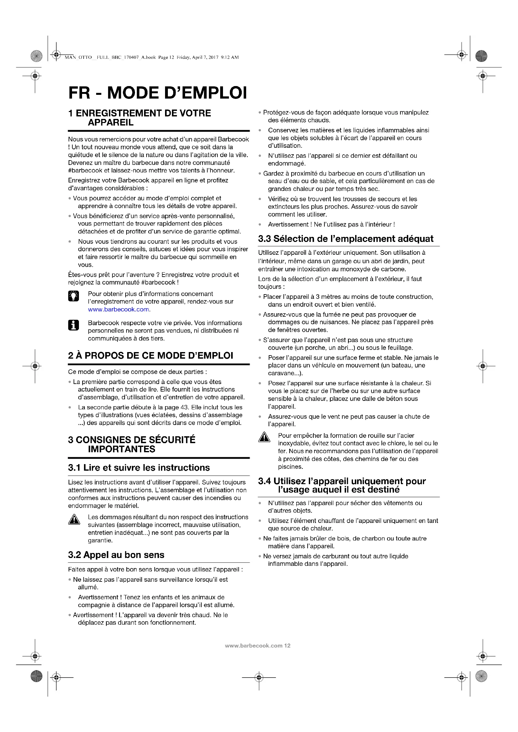 - Ne versez jamais de carburant ou tout autre liquide inflammable dans l’appareil. MAN_OTTO__FULL_BBC_170407_A.book Page 12 Friday, April 7, 2017 9:12 AMwww.barbecook.com 13