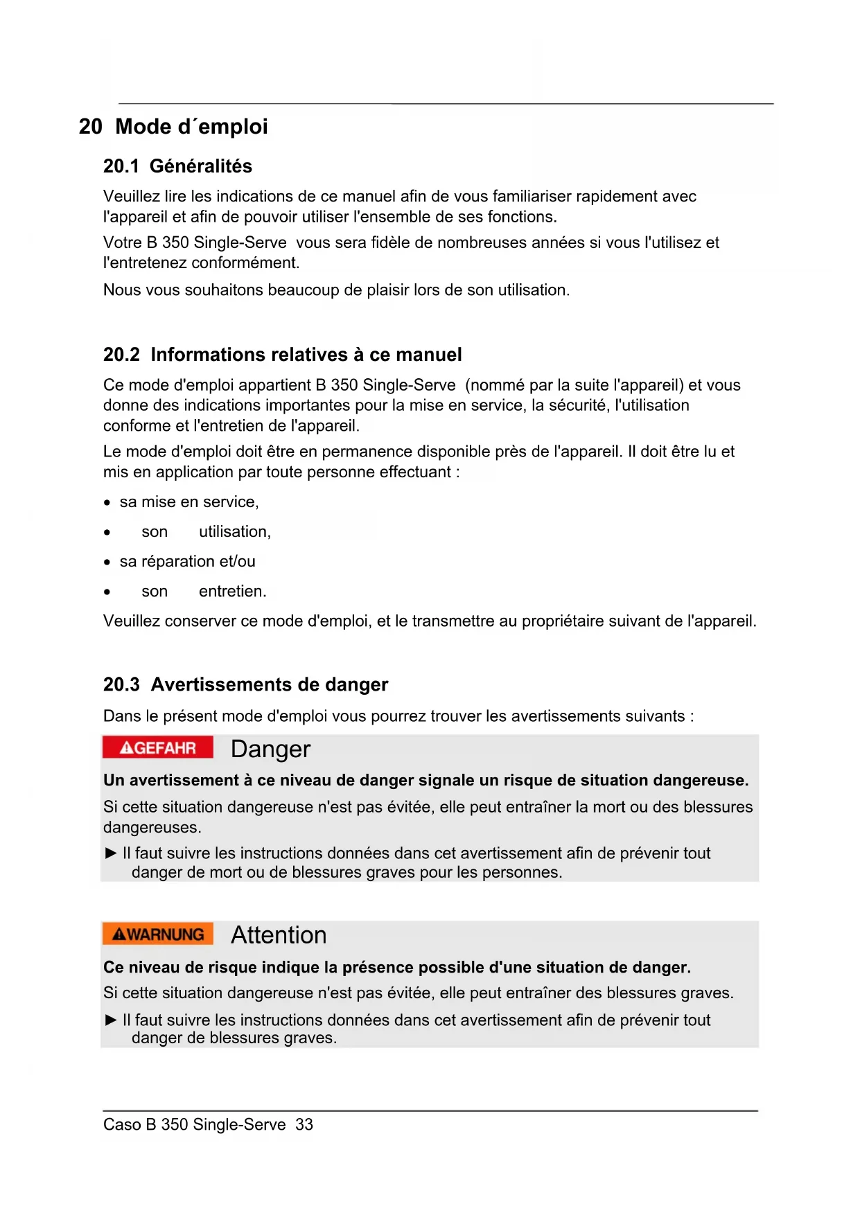 Cette documentation est protégée par la loi sur la propriété intellectuelle. Tous droits de reproduction aussi photomécaniques, de multiplication et de diffusion du texte, dans sa totalité ou en partie, au moyen de processus spéciaux (par exemple informatique, sur support électronique ou en réseau), sont réservés à la Sté. Braukmann GmbH. Modifications techniques et de contenu réservées.Caso B 350 Single-Serve 35 21 Sécurité Ce chapitre vous indiquera des consignes de sécurité importantes pour l'utilisation de cet appareil. Cet appareil répond aux directives de sécurité prescrites. Une utilisation non conforme peut toutefois entraîner des dommages sur les personnes et matériels.
