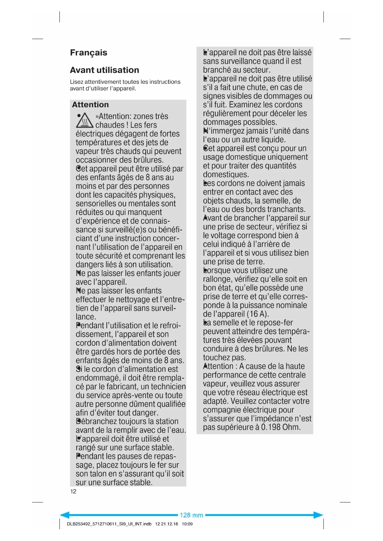 DLB253492_5712710611_SI9_UI_INT.indb 11 21.12.16 10:09Français Avant utilisation Lisez attentivement toutes les instructions avant d’utiliser l’appareil. Attention