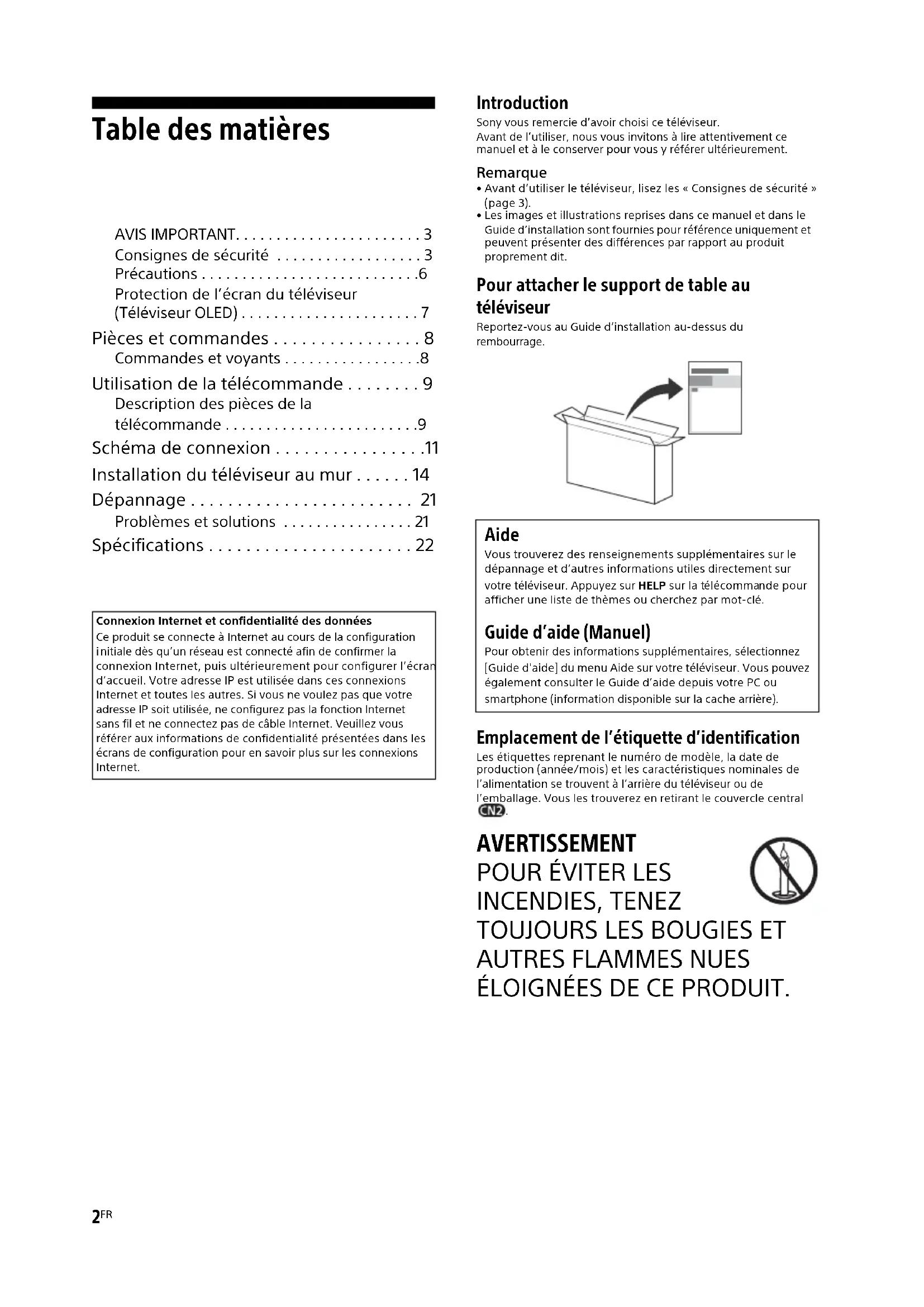 ÉLOIGNÉES DE CE PRODUIT. Connexion Internet et confidentialité des donnéesCe produit se connecte à Internet au cours de la configuration nitiale dès qu’un réseau est connecté afin de confirmer la connexion Internet, puis ultérieurement pour configurer l’écran d’accueil. Votre adresse IP est utilisée dans ces connexions Internet et toutes les autres. Si vous ne voulez pas que votre adresse IP soit utilisée, ne configurez pas la fonction Internet sans fil et ne connectez pas de câble Internet. Veuillez vous référer aux informations de confidentialité présentées dans les écrans de configuration pour en savoir plus sur les connexions Internet. Aide Vous trouverez des renseignements supplémentaires sur le dépannage et d’autres informations utiles directement sur votre téléviseur. Appuyez sur HELP sur la télécommande pour afficher une liste de thèmes ou cherchez par mot-clé. Guide d’aide (Manuel) Pour obtenir des informations supplémentaires, sélectionnez [Guide d'aide] du menu Aide sur votre téléviseur. Vous pouvez également consulter le Guide d’aide depuis votre PC ou smartphone (information disponible sur la cache arrière).3