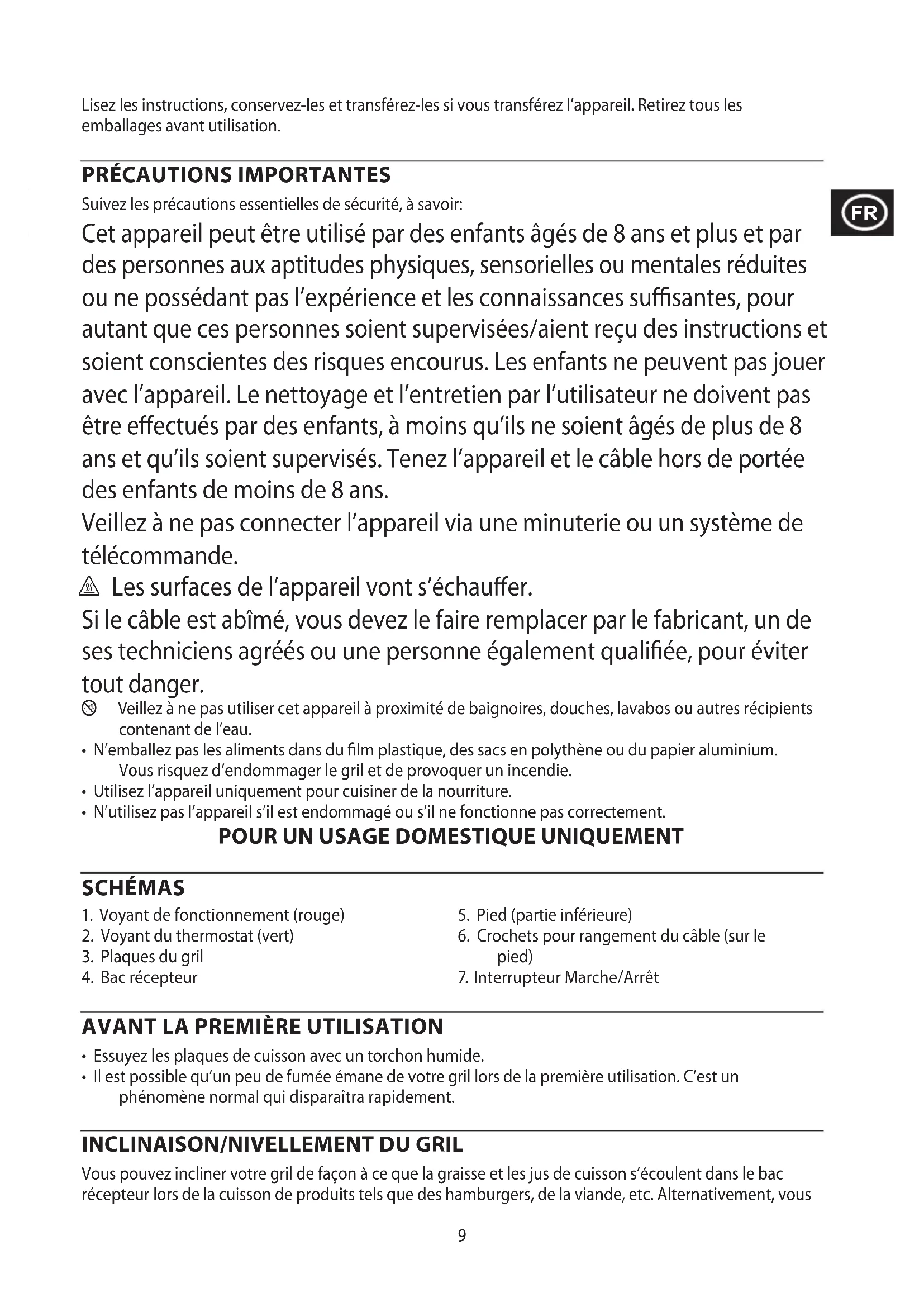 Suivez les précautions essentielles de sécurité, à savoir: Cet appareil peut être utilisé par des enfants âgés de 8 ans et plus et par des personnes aux aptitudes physiques, sensorielles ou mentales réduites ou ne possédant pas l’expérience et les connaissances susantes, pour autant que ces personnes soient supervisées/aient reçu des instructions et soient conscientes des risques encourus. Les enfants ne peuvent pas jouer avec l’appareil. Le nettoyage et l’entretien par l’utilisateur ne doivent pas être eectués par des enfants, à moins qu’ils ne soient âgés de plus de 8 ans et qu’ils soient supervisés. Tenez l’appareil et le câble hors de portée des enfants de moins de 8 ans. Veillez à ne pas connecter l’appareil via une minuterie ou un système de télécommande. ¬ Les surfaces de l’appareil vont s’échauer. Si le câble est abîmé, vous devez le faire remplacer par le fabricant, un de ses techniciens agréés ou une personne également qualiée, pour éviter tout danger. b Veillez à ne pas utiliser cet appareil à proximité de baignoires, douches, lavabos ou autres récipients contenant de l’eau.