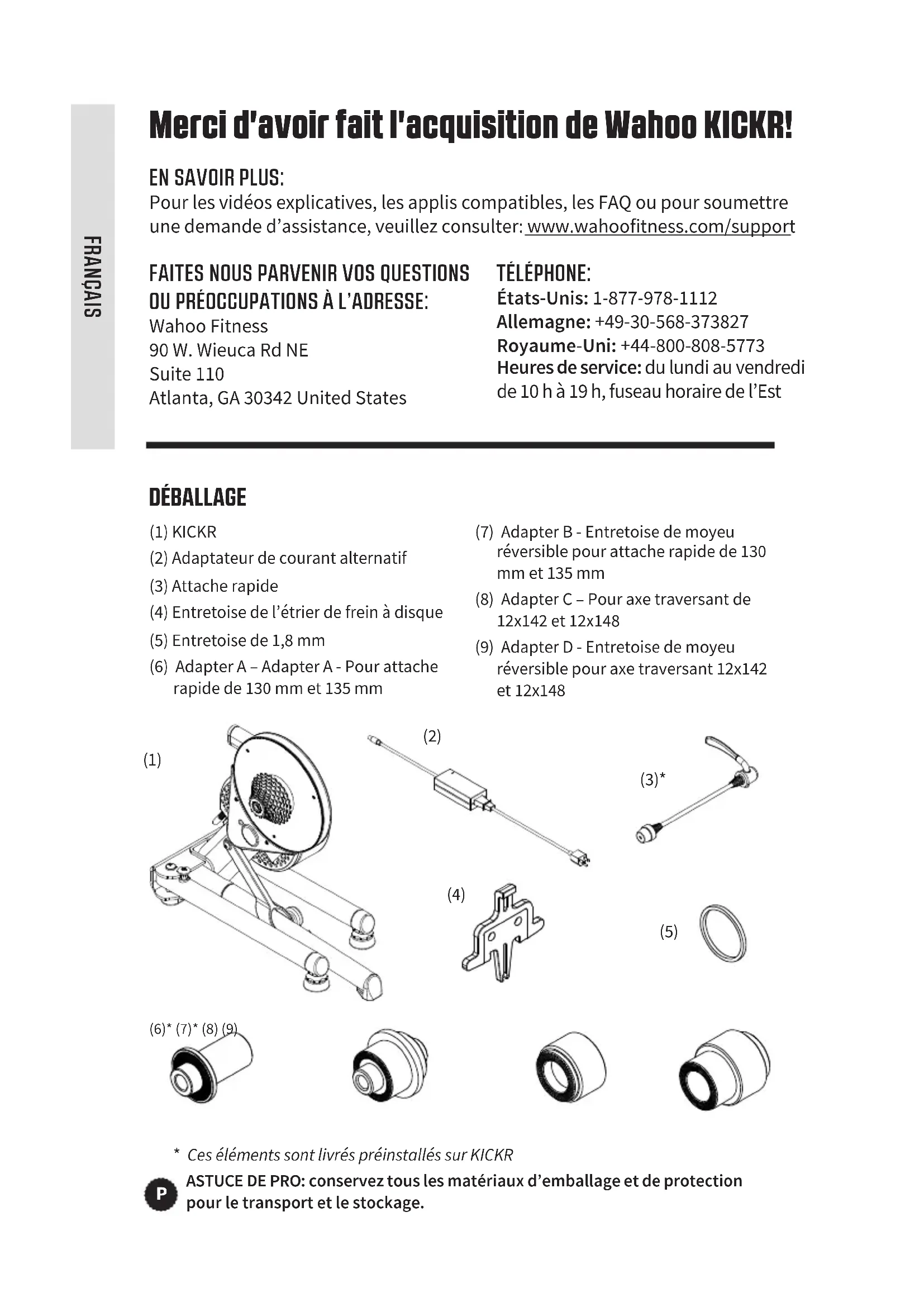 OU PRÉOCCUPATIONS À L’ADRESSE: Wahoo Fitness 90 W. Wieuca Rd NE Suite 110 Atlanta, GA 30342 United States TÉLÉPHONE: États-Unis: 1-877-978-1112 Allemagne: +49-30-568-373827 Royaume-Uni: +44-800-808-5773 Heures de service: du lundi au vendredi de 10 h à 19 h, fuseau horaire de l’Est DÉBALLAGE (1) KICKR (2) Adaptateur de courant alternatif (3) Attache rapide (4) Entretoise de l’étrier de frein à disque (5) Entretoise de 1,8 mm (6) Adapter A – Adapter A - Pour attache rapide de 130 mm et 135 mm (7) Adapter B - Entretoise de moyeu réversible pour attache rapide de 130 mm et 135 mm (8) Adapter C – Pour axe traversant de 12x142 et 12x148 (9) Adapter D - Entretoise de moyeu réversible pour axe traversant 12x142 et 12x148 (6)* (7)* (8) (9) FRANÇAIS12