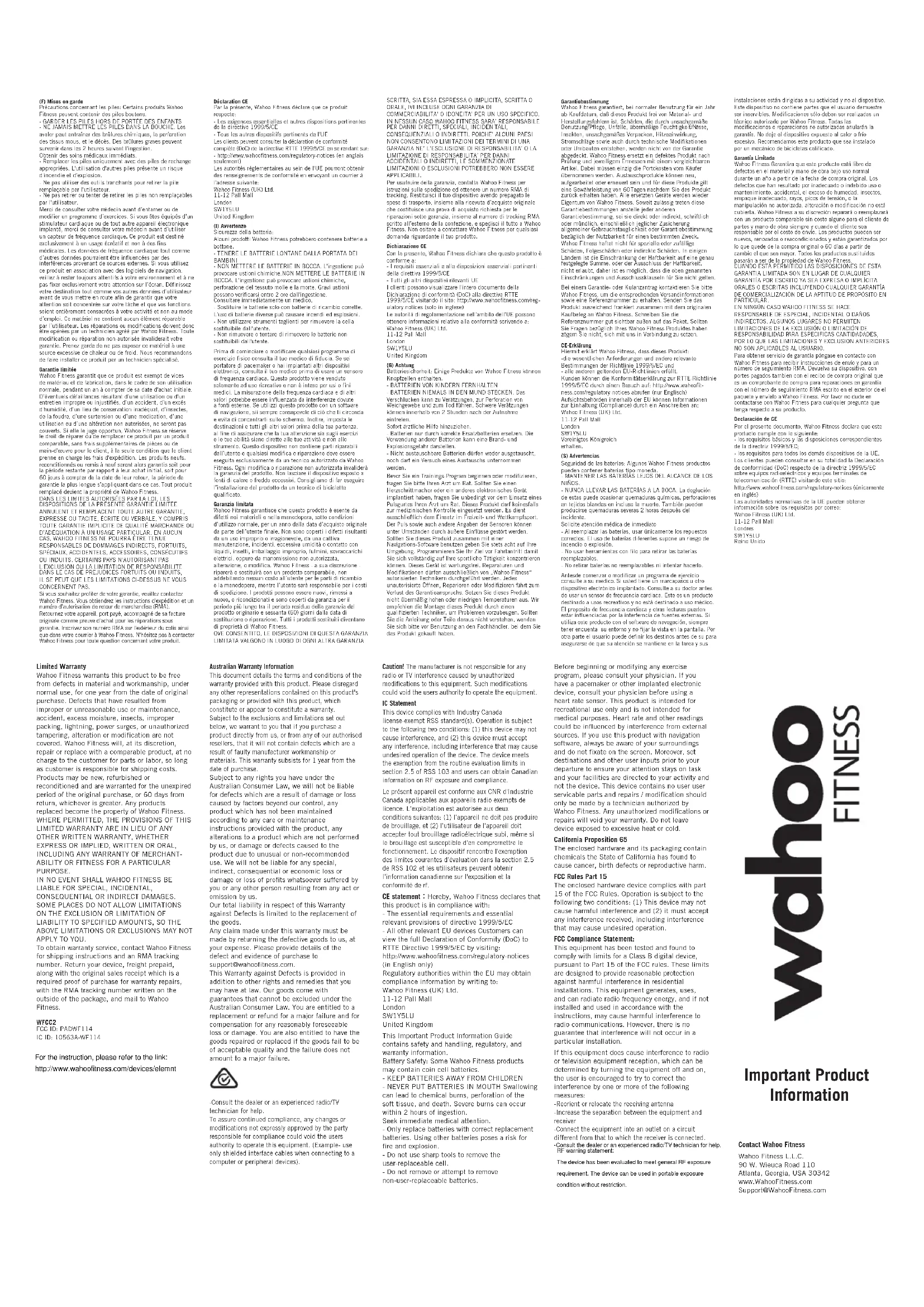 NO SON APLICABLES AL USUARIO. Para obtener servicio de garantía póngase en contacto con Wahoo Fitness para recibir instrucciones de envío y para un número de seguimiento RMA. Devuelva su dispositivo, con portes pagados tambien con el recibo de compra original que es un comprobante de compra para reparaciones en garantía con el número de seguimiento RMA escrito en el exterior de el paquete y envíelo a Wahoo Fitness. Por favor no dude en contactarse con Wahoo Fitness para cualquier pregunta que tenga respecto a su producto. Declaración de CE Por el presente documento, Wahoo Fitness declara que este producto cumple con lo siguiente: - los requisitos básicos y las disposiciones correspondientes de la directriz 1999/5/EC; - los requisitos para todos los demás dispositivos de la UE. Los clientes pueden consultar en su totalidad la Declaración de conformidad (DoC) respecto de la directriz 1999/5/EC sobre equipos radioeléctricos y equipos terminales de telecomunicación (RTTE) visitando este sitio: http://www.wahoofitness.com/regulatory-notices (únicamente en inglés) Las autoridades normativas de la UE pueden obtener información sobre los requisitos por correo: Wahoo Fitness (UK) Ltd. 11-12 Pall Mall Londres SW1Y5LU Reino Unido (F) Mises en garde Précautions concernant les piles: Certains produits Wahoo Fitness peuvent contenir des piles boutons. - GARDER LES PILES HORS DE PORTÉE DES ENFANTS - NE JAMAIS METTRE LES PILES DANS LA BOUCHE. Les avaler peut entraîner des brûlures chimiques, la perforation des tissus mous, et le décès. Des brûlures graves peuvent survenir dans les 2 heures suivant l'ingestion. Obtenir des soins médicaux immédiats. - Remplacer les piles uniquement avec des piles de rechange appropriées. L'utilisation d'autres piles présente un risque d'incendie et d'explosion. - Ne pas utiliser des outils tranchants pour retirer la pile remplaçable par l'utilisateur. - Ne pas retirer ou tenter de retirer les piles non remplaçables par l'utilisateur. Merci de consulter votre m édecin avant d’entamer ou de modifier un programme d’exercices. Si vous êtes équipés d’un stimulateur cardiaque ou de tout autre appareil électronique implanté, merci de consulter votre médecin avant d’utiliser un capteur de fréquence cardiaque. Ce produit est destiné exclusivement à un usage r écréatif et non à des fins médicales. Les donné es de fréquence cardiaque tout comme d’autres données pourraient être influenc ées par des interférences provenant de sources externes. Si vous utilisez ce produit en association avec des logiciels de navigation, veillez à rester toujours attentifs à votre environnement et à ne pas fixer exclusivement votre attention sur l’écran. Définissez votre destination tout comme vos autres données d’utilisateur avant de vous mettre en route afin de garantir que votre attention soit concentrée sur votre tâche et que vos fonctions soient entièrement consacrées à votre activité et non au mode d’emploi. Ce matériel ne contient aucun élément réparable par l’utilisateur. Les réparations ou modifications doivent donc être opérées par un technicien agréé par Wahoo Fitness. Toute modification ou réparation non-autorisée invaliderait votre garantie. Prenez garde de ne pas exposer ce matériel à une source excessive de chaleur ou de froid. Nous recommandons de faire installer ce produit par un technicien spécialisé. Garantie limitée Wahoo Fitness garantit que ce produit est exempt de vices de matériau et de fabrication, dans le cadre de son utilisation normale, pendant un an à compter de sa date d'achat initiale. D’éventuels défaillances résultant d’une utilisation ou d'un entretien impropre ou injustifiés, d’un accident, d’un excés d'humidité, d’un lieu de conservation inadéquat, d’insectes, de la foudre, d’une surtension ou d’une modication, d’une utilisation ou d’une altération non autorisées, ne seront pas couverts. Si elle le juge opportun, Wahoo Fitness se réserve le droit de réparer ou de remplacer ce produit par un produit comparable, sans frais supplémentaires de pièces ou de main-d'œuvre pour le client, à la seule condition que le client prenne en charge les frais d'expédition. Les produits neufs, reconditionnés ou remis à neuf seront alors garantis soit pour la période restante par rapport à leur achat initial, soit pour 60 jours à compter de la date de leur retour, la période de garantie la plus longue s’appliquant dans ce cas. Tout produit remplacé devient la propriété de Wahoo Fitness. DANS LES LIMITES AUTORISÉES PAR LA LOI, LES DISPOSITIONS DE LA PRÉSENTE GARANTIE LIMITÉE ANNULENT ET REMPLACENT TOUTE AUTRE GARANTIE, EXPRESSE OU TACITE, ÉCRITE OU VERBALE, Y COMPRIS TOUTE GARANTIE IMPLICITE DE QUALITÉ MARCHANDE OU D’ADÉQUATION À UN USAGE PARTICULAR. EN AUCUN CAS, WAHOO FITNESS NE POURRA ÊTRE TENUE