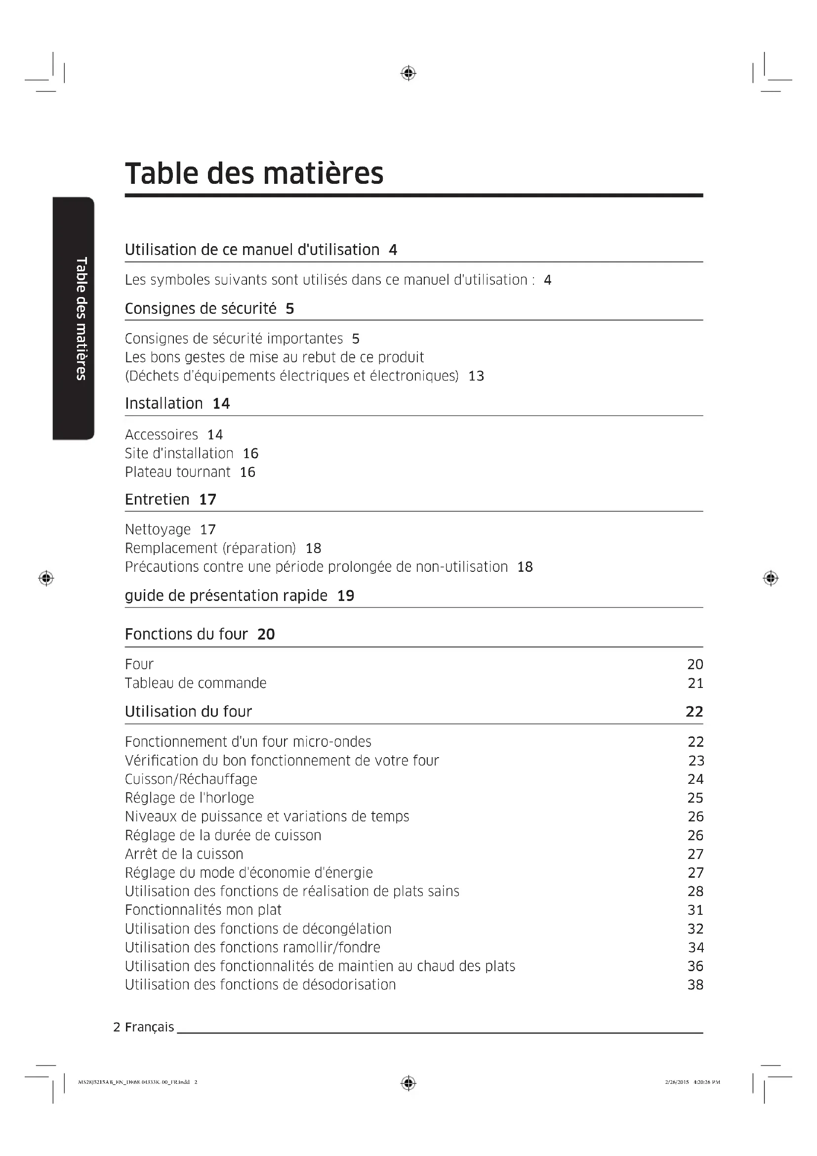 Table des matières Utilisation des fonctions Sécurité enfants 39 Utilisation des fonctions marche/arrêt du plateau tournant 39 Arrêt du signal sonore 40 Guide des récipients 41 Dépannage 43 Dépannage 43 Code d’information 47 Caractéristiques techniques 48 MS28J5215AB_EN_DE68-04333K-00_FR.indd 3 2/26/2015 4:20:26 PM4 Français Utilisation de ce manuel d'utilisation Vous venez d'acquérir un four micro-ondes SAMSUNG. Ce manuel contient de nombreux conseils et instructions sur l'utilisation de votre micro-ondes: