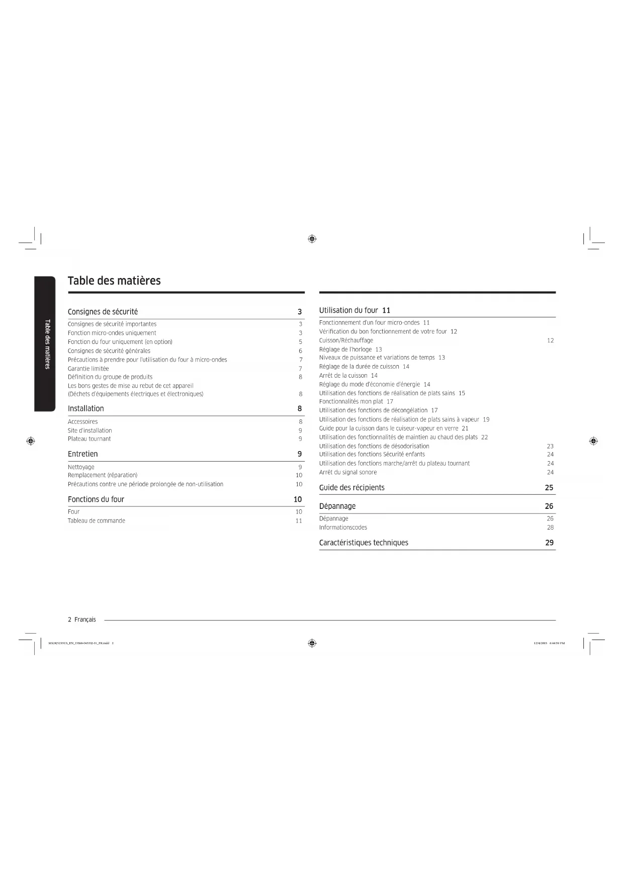 Four micro-ondes Manuel d’utilisation MS28J5255** MS28J5255US_EN_DE68-04333J-01_FR.indd 1 12/4/2015 6:44:59 PM2 Français Table des matières Utilisation du four 11 Fonctionnement d'un four micro-ondes 11 Vérication du bon fonctionnement de votre four 12 Cuisson/Réchauffage 12 Réglage de l'horloge 13 Niveaux de puissance et variations de temps 13 Réglage de la durée de cuisson 14 Arrêt de la cuisson 14 Réglage du mode d'économie d'énergie 14 Utilisation des fonctions de réalisation de plats sains 15 Fonctionnalités mon plat 17 Utilisation des fonctions de décongélation 17 Utilisation des fonctions de réalisation de plats sains à vapeur 19 Guide pour la cuisson dans le cuiseur-vapeur en verre 21 Utilisation des fonctionnalités de maintien au chaud des plats 22 Utilisation des fonctions de désodorisation 23 Utilisation des fonctions Sécurité enfants 24 Utilisation des fonctions marche/arrêt du plateau tournant 24 Arrêt du signal sonore 24 Guide des récipients 25 Dépannage 26 Dépannage 26 Informationscodes 28 Caractéristiques techniques 29 Table des matières Consignes de sécurité 3 Consignes de sécurité importantes 3 Fonction micro-ondes uniquement 3 Fonction du four uniquement (en option) 5 Consignes de sécurité générales 6 Précautions à prendre pour l'utilisation du four à micro-ondes 7 Garantie limitée 7 Dénition du groupe de produits 8 Les bons gestes de mise au rebut de cet appareil (Déchets d’équipements électriques et électroniques) 8 Installation 8 Accessoires 8 Site d'installation 9 Plateau tournant 9 Entretien 9 Nettoyage 9 Remplacement (réparation) 10 Précautions contre une période prolongée de non-utilisation 10 Fonctions du four 10 Four 10 Tableau de commande 11 MS28J5255US_EN_DE68-04333J-01_FR.indd 2 12/4/2015 6:44:59 PMFrançais 3 Consignes de sécurité Consignes de sécurité