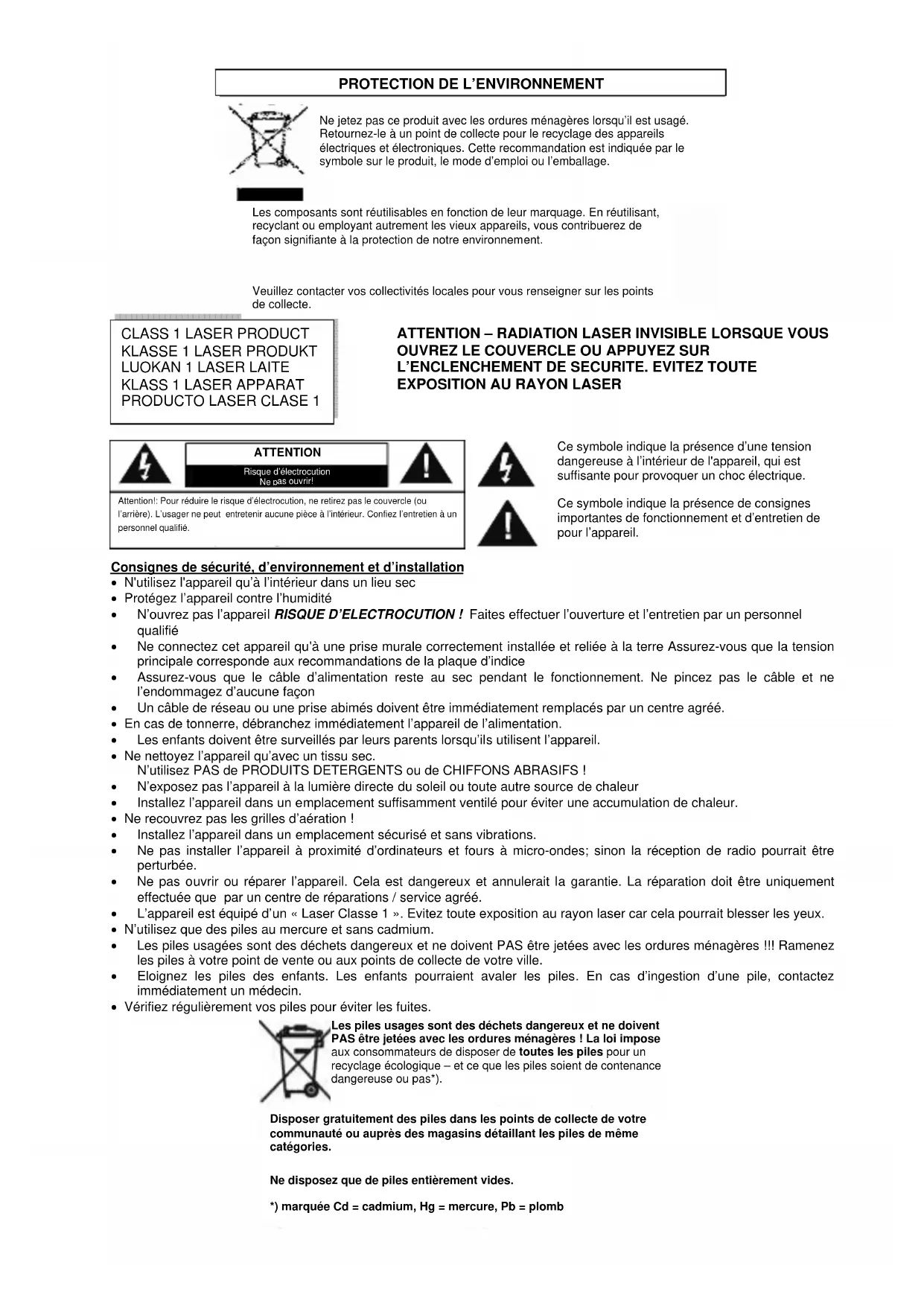 ttention!: Pour réduire le risque d’électrocution, ne retirez pas le couvercle (ou l’arrière). L’usager ne peut entretenir aucune pièce à l’intérieur. Confiez l’entretien à un personnel qualifié. Les piles usages sont des déchets dangereux et ne doivent PAS être jetées avec les ordures ménagères ! La loi impose aux consommateurs de disposer de toutes les piles pour un recyclage écologique – et ce que les piles soient de contenance dangereuse ou pas*). Disposer gratuitement des piles dans les points de collecte de votre communauté ou auprès des magasins détaillant les piles de même catégories. Ne disposez que de piles entièrement vides. *) marquée Cd = cadmium, Hg = mercure, Pb = plombM_NR545DAB