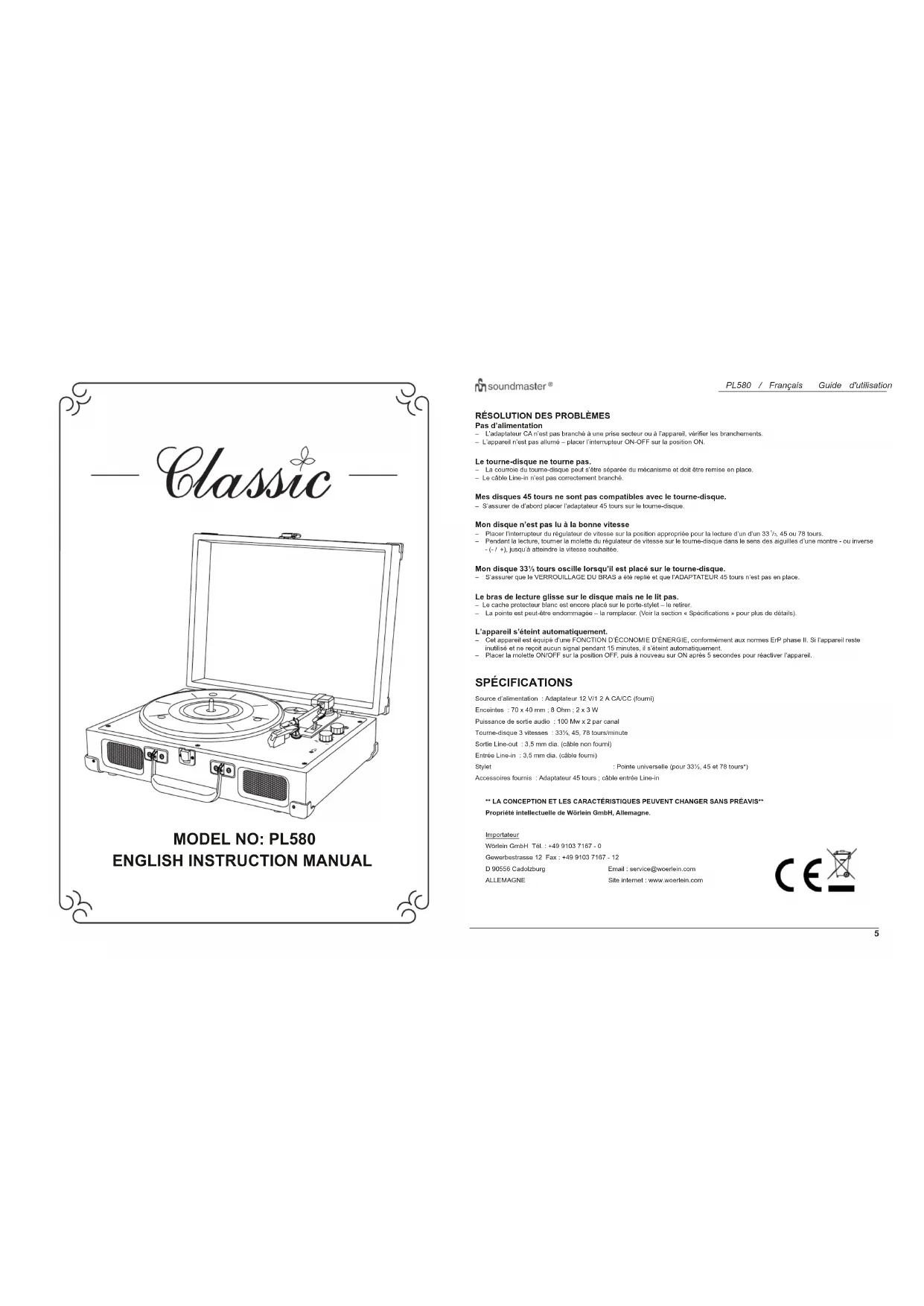 , 45 ou 78 tours. – Pendant la lecture, tourner la molette du régulateur de vitesse sur le tourne-disque dans le sens des aiguilles d’une montre - ou inverse +), jusqu’à atteindre la vitesse souhaitée. Mon disque 33ѿ tours oscille lorsqu’il est placé sur le tourne-disque. – S’assurer que le VERROUILLAGE DU BRAS a été replié et que l’ADAPTATEUR 45 tours n’est pas en place. Le bras de lecture glisse sur le disque mais ne le lit pas. – Le cache protecteur blanc est encore placé sur le porte-stylet – le retirer. – La pointe est peut-être endommagée – la remplacer. (Voir la section « Spécifications » pour plus de détails). L’appareil s’éteint automatiquement. – Cet appareil est équipé d’une FONCTION D’ÉCONOMIE D’ÉNERGIE, conformément aux normes ErP phase II. Si l’appareil reste et ne reçoit aucun signal pendant 15 minutes, il s’éteint automatiquement. – Placer la molette ON/OFF sur la position OFF, puis à nouveau sur ON après 5 secondes pour réactiver l’appareil. SPÉCIFICATIONS Source d’alimentation : Adaptateur 12 V/1 2 A CA/CC (fourni) Enceintes : 70 x 40 mm ; 8 Ohm ; 2 x 3 W Puissance de sortie audio : 100 Mw x 2 par canal Tourne-disque 3 vitesses : 33ѿ, 45, 78 tours/minute Sortie Line-out : 3,5 mm dia. (câble non fourni) Entrée Line-in : 3,5 mm dia. (câble fourni) Stylet : Pointe universelle (pour 33ѿ, 45 et 78 tours*) Accessoires fournis : Adaptateur 45 tours ; câble entrée Line-in ** LA CONCEPTION ET LES CARACTÉRISTIQUES PEUVENT CHANGER SANS PRÉAVIS** Propriété intellectuelle de Wörlein GmbH, Allemagne. Importateur Wörlein GmbH Tél. : +49 9103 7167 - 0 Gewerbestrasse 12 Fax : +49 9103 7167 - 12 D 90556 Cadolzburg Email : service@woerlein.com ALLEMAGNE Site internet : www.woerlein.com