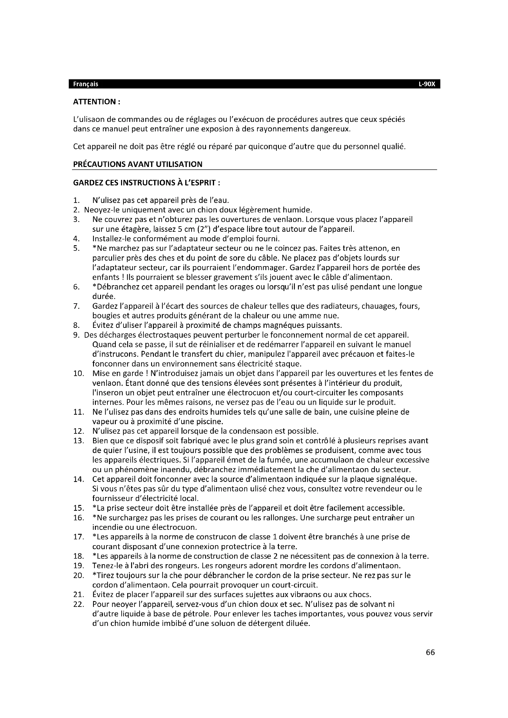 Besuchen Sie bitte für weitere Informationen und unseren Kundendienst unsere Homepage www.lenco.com Lenco Benelux BV, Thermiekstraat 1a, 6361 HB, Die Niederlande.66 Français L-90X ATTENTION : L’utilisation de commandes ou de réglages ou l’exécution de procédures autres que ceux spécifiés dans ce manuel peut entraîner une exposition à des rayonnements dangereux. Cet appareil ne doit pas être réglé ou réparé par quiconque d’autre que du personnel qualifié.