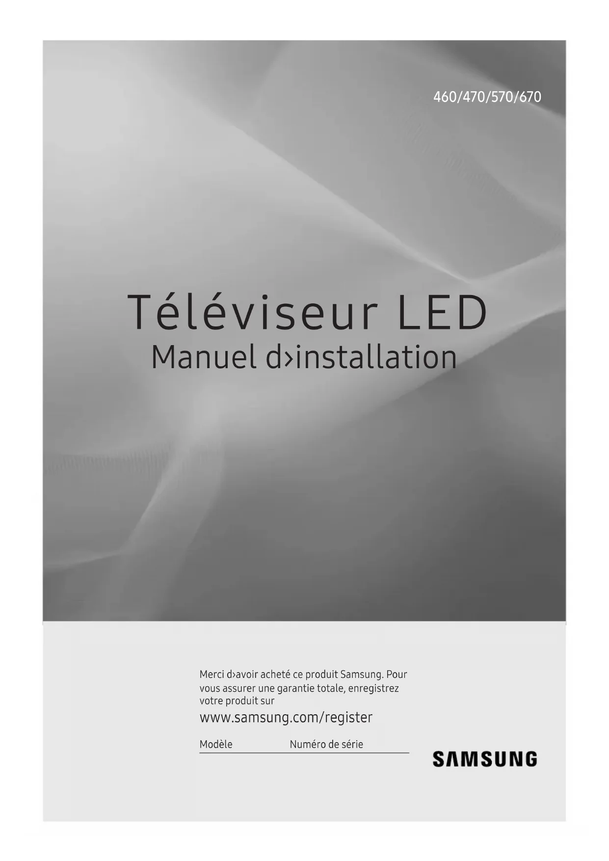 Téléviseur LED Manuel d›installation Merci d›avoir acheté ce produit Samsung. Pour vous assurer une garantie totale, enregistrez votre produit sur www.samsung.com/register Modèle Numéro de série 460/470/570/670Les schémas et illustrations contenus dans ce mode d’emploi sont fournis uniquement à titre de référence. L’aspect réel