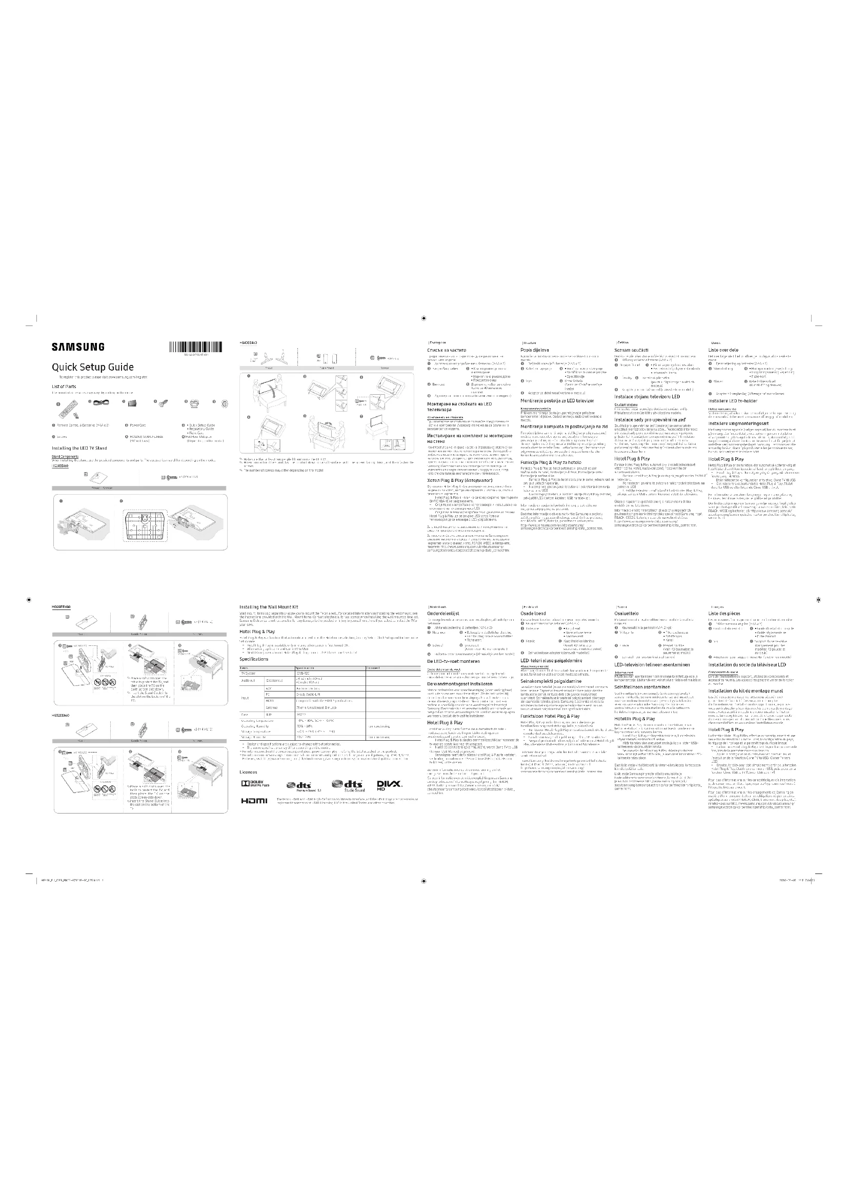 au-delà )6 Adaptateur pour support mural (En fonction du modèle) Installation du socle du téléviseur LED Composants du socleaccessoires fournis. Les accessoires peuvent varier en fonction du modèle. Installation du kit de montage mural Les éléments de montage mural (vendus séparément) permettent de fixer le téléviseur au mur. Pour plus vous aux instructions fournies avec les éléments de montage Hotel Plug & Play seule fois la sélection du mode Hotel, la configuration du pays, fois, lors de la première mise sous tension. Après la configuration du téléviseur en premier lieu et Ensuite, le téléviseur doit simplement sortir de la fonction samsungelectronics/corporatecitizenship/data_corner.html Installing the Wall Mount Kit