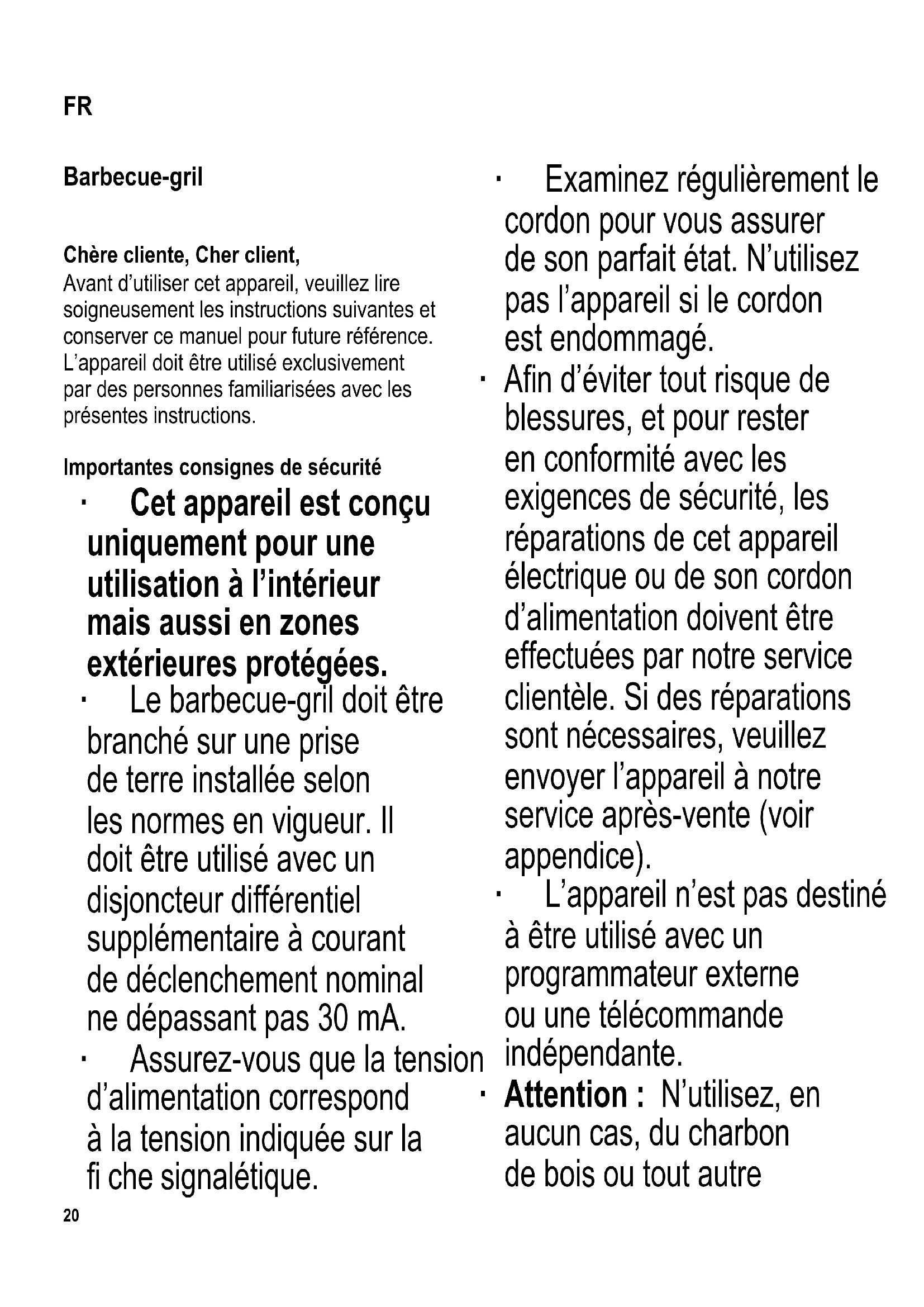 Attention : Ce symbole indique que la surface de cuisson et les surfaces extérieures accessibles deviennent très chaudes pendant le fonctionnement. Ne touchez aucune partie de l’appareil à l’exception des poignées pendant et après l’utilisation. ∙ Avant de nettoyer le gril, débranchez-le du secteur, retirez la fi che thermostat et laissez totalement refroidir le gril. ∙ Pour éviter tout risque de choc électrique, le cordon d’alimentation et la fi che avec thermostat ne doivent pas être plongés dans du liquide ou même entrer en contact avec du liquide. ∙ Nettoyez la plaque de cuisson à l’eau savonneuse. Assurez-vous que la grille de cuisson avec le raccord thermostat est absolument sèche avant une nouvelle utilisation du gril. ∙ Pour des informations détaillées concernant le nettoyage de l’appareil, veuillez vous référer au paragraphe Entretien et nettoyage. ∙ Cet appareil est destiné à être utilisé dans des applications domestiques et analogues telles que : - des coins cuisines réservés au personnel dans des magasins, bureaux et autres environnements professionnels ; - des fermes ;22 - l’utilisation par les clients des hôtels, motels et autres environnements à caractère résidentiel ; - des environnements de type chambres d’hôtes. ∙ Cet appareil peut être utilisé par des enfants (à partir de 8 ans) et par des personnes souffrant de défi ciences physiques, sensorielles ou mentales, ou manquant d’expérience ou de connaissances, s’ils ont été formés à l’utilisation de l’appareil et ont été supervisés, et s’ils en comprennent les dangers et les précautions de sécurité à prendre. ∙ Les enfants ne sont pas autorisés à jouer avec l’appareil. ∙ Les enfants ne doivent pas être autorisés à nettoyer ou entretenir l’appareil à moins d’être supervisés et d’avoir plus de 8 ans. ∙ L’appareil et son cordon d’alimentation doivent être, à tout moment, tenus hors de portée des enfants de moins de 8 ans. ∙ Attention : Tenez les enfants à l’écart des emballages, qui représentent un risque potentiel, par exemple, de suffocation. ∙ Attention : En aucun cas ne recouvrez la plaque de cuisson complètement avec du papier aluminium, des plats à barbecue ou d’autres articles car l’accumulation de chaleur qui en résulterait pourrait endommager le gril de manière irréparable. ∙ Avant d’utiliser cet appareil, vérifi ez que tous les accessoires fournis sont en parfait état. Ne l’utilisez pas s’il est tombé sur une surface dure : en effet, des dégâts invisibles peuvent avoir des incidences fâcheuses sur son bon fonctionnement. Dans ce cas, contactez notre Service Clientèle. ∙ Assurez-vous que le gril et le support sont en position stable et sûre. Disposez le cordon de façon à ce que personne ne puisse se prendre les pieds dedans. ∙ Utilisez le gril exclusivement sur une surface résistant à la chaleur et aux éclaboussures. Celles-ci ne sont pas toujours évitables lors de la cuisson d’aliments à forte teneur en graisse ou en eau.23 ∙ N’installez pas le gril près d’un mur ou dans un coin et assurez-vous qu’il n’y a aucun matériau infl ammable à proximité. ∙ Avant l’utilisation du gril, assurez-vous toujours que le bac de récupération des graisses est installé correctement sur le barbecue-gril. ∙ Ne laissez à aucun moment le barbecue- gril fonctionner sans surveillance. ∙ Assurez-vous que le cordon ne touche aucune partie chaude de l’appareil. ∙ Retirer la fi che de la prise : - après chaque utilisation, - en cas d’éventuelles perturbations pendant l’emploi, - avant chaque nettoyage. ∙ L’utilisation d’un prolongateur en bobine entraîne une perte de puissance qui peut aussi faire chauffer le cordon. Il est donc nécessaire de dérouler entièrement le prolongateur si vous en utilisez un de ce type. Un prolongateur peut être utilisé dans une zone protégée en plein air, à condition qu’il soit d’un type approuvé pour ce genre d’usage. ∙ Attention : Ne pas déplacer le barbecue-gril pendant son utilisation. Avant de déplacer, transporter ou ranger le gril, assurez-vous qu’il a suffi samment refroidi. ∙ Ne laissez pas le gril dehors ou dans un endroit dans lequel il sera soumis à des températures extrêmes ou une température élevée. ∙ Le fabricant décline toute responsabilité en cas de dégâts dus à une utilisation erronée ou au non-respect des consignes de sécurité de l’appareil. ∙ Ce produit est conforme à toutes les directives relatives au marquage “CE”. Aperçu et pièces incluses (voir diagramme A au début de ce manuel)