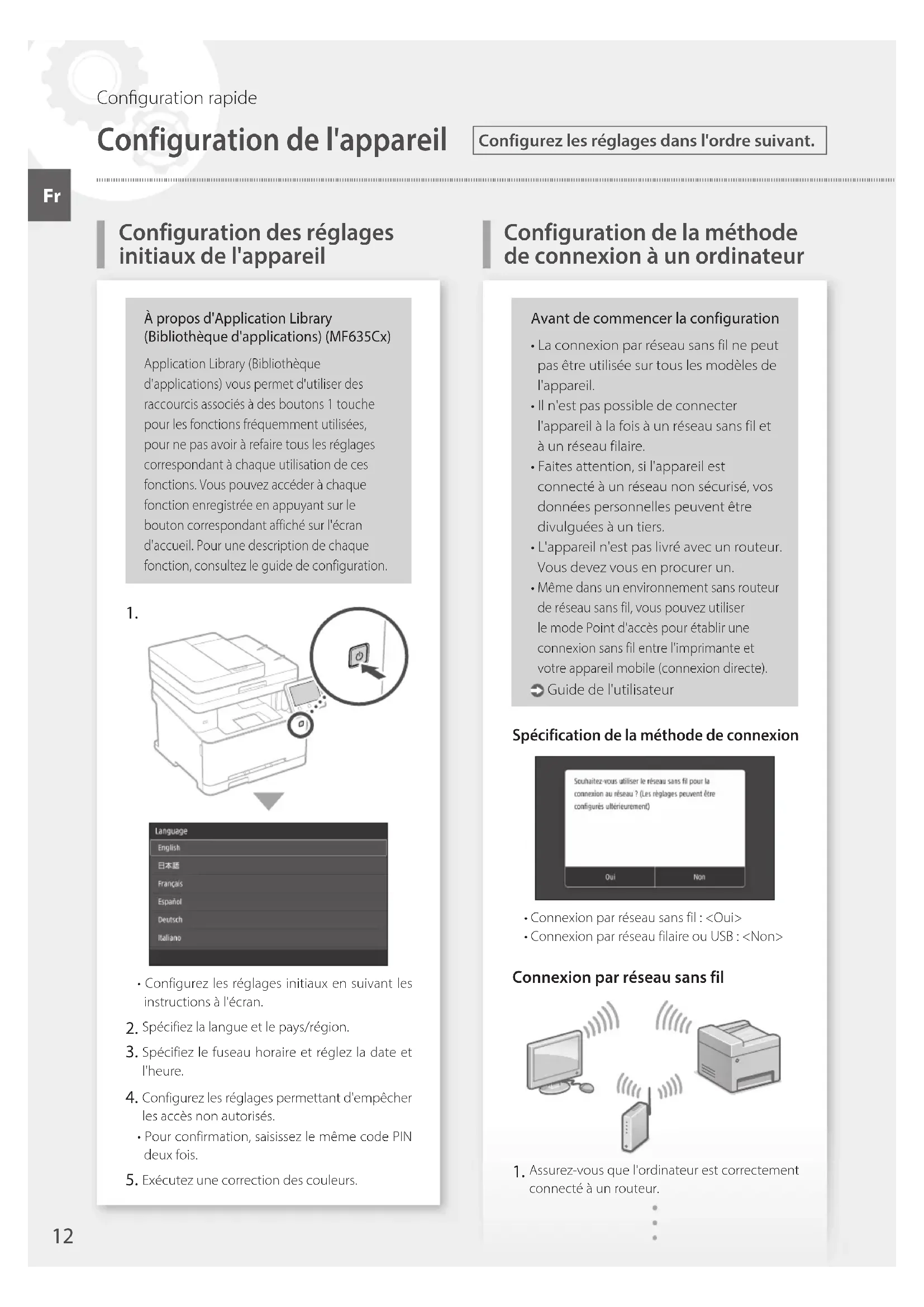 - Configurez les réglages initiaux en suivant les instructions à l'écran. Spécifiez la langue et le pays/région. Spécifiez le fuseau horaire et réglez la date et l'heure. Configurez les réglages permettant d'empêcher les accès non autorisés.• Pour confirmation, saisissez le même code PIN deux fois. Exécutez une correction des couleurs.Avant de commencer la configuration• La connexion par réseau sans fil ne peut pas être utilisée sur tous les modèles de l'appareil.• Il n'est pas possible de connecter l'appareil à la fois à un réseau sans fil et à un réseau filaire.• Faites attention, si l'appareil est connecté à un réseau non sécurisé, vos données personnelles peuvent être divulguées à un tiers.• L'appareil n'est pas livré avec un routeur. Vous devez vous en procurer un. Même dans un environnement sans routeur de réseau sans fil, vous pouvez utiliser le mode Point d'accès pour établir une connexion sans fil entre l'imprimante et votre appareil mobile (connexion directe). Guide de l'utilisateur Spécification de la méthode de connexion