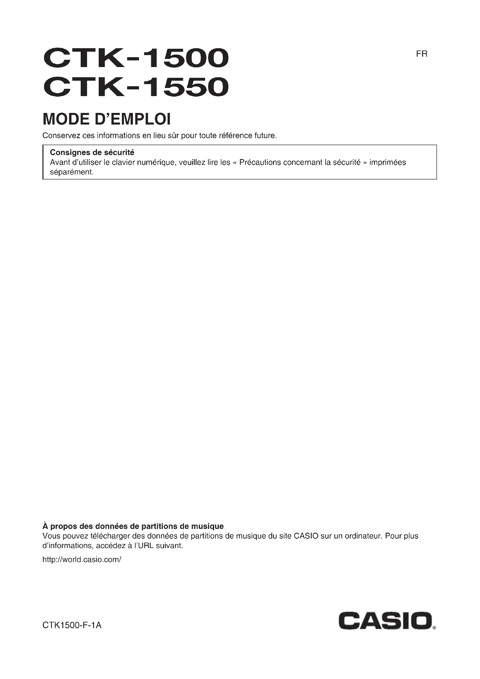 - Ne pas oublier de débrancher l’adaptateur secteur avant de nettoyer le produit. ● Toute reproduction du contenu de ce manuel, complète ou partielle, est interdite. Toute utilisation du contenu de ce manuel dans d’autres buts que personnels sans l’autorisation de CASIO est formellement interdite par les lois du copyright. ● EN AUCUN CAS CASIO NE PEUT ÊTRE TENU POUR RESPONSABLE DES DOMMAGES, QUELS QU’ILS SOIENT (Y COMPRIS MAIS SANS S’Y LIMITER, DES DOMMAGES DUS AUX PERTES DE BÉNÉFICES, D’INTERRUPTION D’AFFAIRES, D’INFORMATIONS) RÉSULTANT DE L’EMPLOI OU DE L’IMPOSSIBILITÉ D’EMPLOYER CE MANUEL OU CE PRODUIT, MÊME SI CASIO A ÉTÉ AVISÉ DE LA POSSIBILITÉ DE TELS DOMMAGES. ● Le contenu de ce manuel est susceptible d’être changé sans avis préalable. ● L’aspect réel du produit peut être différent de celui qui est illustré dans ce mode d’emploi. ● Les noms de sociétés et de produits utilisés dans ce manuel peuvent être des marques déposées de tiers. Manufacturer: CASIO COMPUTER CO., LTD. 6-2, Hon-machi 1-chome, Shibuya-ku, Tokyo 151-8543, Japan Responsible within the European Union: Casio Europe GmbH Casio-Platz 1, 22848 Norderstedt, Germany www.casio-europe.com Déclaration de conformité à la Directive de l’Union Européenne CTK1500-F-1A.indd 2 2016/08/10 15:33:41FR-1 Guide général FR-2 Dépassement de temps . . . . . . . . . . . . . . . . . . . . . FR-4 Utilisation du pavé numérique (9). . . . . . . . . . . . . FR-4 Utilisation du bouton FUNCTION (bm) . . . . . . . . . . FR-4 Se préparer à jouer FR-7 Installation du pupitre à musique . . . . . . . . . . . . . . FR-7 Alimentation . . . . . . . . . . . . . . . . . . . . . . . . . . . . . . FR-7 Jouer du clavier numérique FR-8 Mise sous tension et interprétation . . . . . . . . . . . . . FR-8 Écoute des chansons de démonstration. . . . . . . . . FR-8 Utilisation d’un casque d’écoute . . . . . . . . . . . . . . . FR-8 Régler les sons du clavier FR-9 Sélection parmi les nombreux sons d’instruments de musique . . . . . . . . . . . . . . . . . . FR-9 Jouer en mode de musique de danse FR-10 Mode musique de danse. . . . . . . . . . . . . . . . . . . . FR-10 Fonctions du clavier de commutateurs . . . . . . . . . FR-10 Utilisation du mode de musique de danse . . . . . . FR-11 Création d’un Build Up . . . . . . . . . . . . . . . . . . . . . FR-11 Réglages du mode de musique de danse. . . . . . . FR-12 Écouter les chansons intégrées FR-12 Écoute d’une chanson particulière . . . . . . . . . . . . FR-12 Utiliser les chansons intégrées pour maîtriser le clavier FR-14 Leçon avec éclairage . . . . . . . . . . . . . . . . . . . . . . FR-14 Réglages que vous pouvez utiliser pendant la Leçon Lite. . . . . . . . . . . . . . . . . . . . . . . . . . . . FR-14 Utilisation de l’accompagnement automatique FR-15 Exécution de la partie rythme seulement . . . . . . . FR-15 Exécution de toutes les parties . . . . . . . . . . . . . . . FR-15 Utilisation optimale de l’accompagnement automatique . . . . . . . . . . . . . . . . . . . . . . . . . . . . FR-17 Raccorder d’autres appareils FR-17 Raccordement à un appareil audio . . . . . . . . . . . . FR-17 Référence FR-18 En cas de problème . . . . . . . . . . . . . . . . . . . . . . . FR-18 Rétablissement des réglages par défaut du clavier numérique. . . . . . . . . . . . . . . . . . . . . . . . FR-19 Fiche technique. . . . . . . . . . . . . . . . . . . . . . . . . . . FR-20 Précautions d’emploi. . . . . . . . . . . . . . . . . . . . . . . FR-21 Appendice A-1 Liste des sonorités . . . . . . . . . . . . . . . . . . . . . . . . . . . A-1 Liste des sons de batterie. . . . . . . . . . . . . . . . . . . . . . A-2 Liste des rythmes . . . . . . . . . . . . . . . . . . . . . . . . . . . . A-3 Liste des chansons . . . . . . . . . . . . . . . . . . . . . . . . . . . A-4 Liste du mode de musique de danse . . . . . . . . . . . . . A-5 Guide des doigtés. . . . . . . . . . . . . . . . . . . . . . . . . . . . A-6 Liste des exemples d’accords. . . . . . . . . . . . . . . . . . . A-7 Sommaire Accessoires fournis ● Pupitre à musique ● Brochures