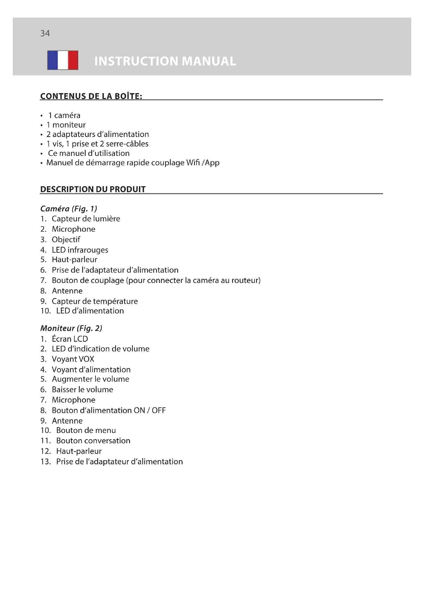 INSTRUCTION MANUAL35 LUVION Premium Baby products INSTRUCTION MANUAL INSTALLATION1. CONFIGURATION DE LA CAMÉRA ET DU MONITEUR1.1 Alimentation de la caméraBranchez une extrémité de l’adaptateur secteur fourni dans une prise murale et l’autre extrémité à l’arrière de la caméra. La caméra s’allume automatiquement lorsqu’elle est branchée (voir Fig. 3). REMARQUE: Utilisez l’adaptateur intitulé OUTPUT: 5V DC 2.0A pour la caméra. 1.2 Placement de la caméraPlacez la caméra à l’endroit qui vous convient, dirigez l’objectif vers la zone d’observa-tion.REMARQUE: Ne tournez pas la caméra manuellement ! La rotation de la tête de la caméra doit être eff ectuée seulement via le menu du moniteur (voir Fig. 11).1.3 Vision nocturneLa caméra est équipée de 8 LED haute intensité pour créer des images claires dans l’obscurité. Lorsque le capteur de lumière détecte des niveaux de lumière ambiante bas, les LED sont automatiquement activées. 1.4 Mesure de la température ambianteLe capteur de température mesure la température ambiante du côté de la caméra, la température s’affi chera sur l’écran du moniteur.1.5 Alimentation du moniteurLe moniteur est équipé d’une batterie 3.7V 2600mAh (Li-ion) et utilise le courant secteur.1. Branchez une extrémité de l’adaptateur secteur fourni dans une prise murale et l’autre extrémité sur le moniteur (voir Fig. 4).2. Faites glisser le bouton d’alimentation sur «ON» (voir Fig. 4).REMARQUE 1: Utilisez l’adaptateur intitulé OUTPUT: 5V DC 1.0A pour le moniteur.REMARQUE 2: Lorsque le moniteur est sous tension, le voyant d’alimentation s’allume en vert. Lorsque la batterie est faible, la LED d’alimentation commence à clignoter en rouge. Lorsque la batterie est en cours de charge, la LED d’alimentation s’allume de façon continue en rouge. Une fois la batterie complètement chargée, la LED d’alimentation s’éteint (si le moniteur est éteint).REMARQUE 3: “” (hors de portée) s’affi che sur l’écran LCD si le moniteur et la caméra sont trop éloignés l’un de l’autre. he monitor has a built in 3.7V 2600mAh (Li-ion) battery and uses household AC power current.2. BOUTONS DU MONITEUR2.1 Réglage du volumeAppuyezsur augmenter le volume ou baisser le volume pour régler le volu-me (voir Fig. 5) 2.2 Fonction conversationAppuyez et maintenez le bouton conversation pour parler à travers la caméra, l’icône sera affi chée sur l’écran (voir Fig. 6). FR36