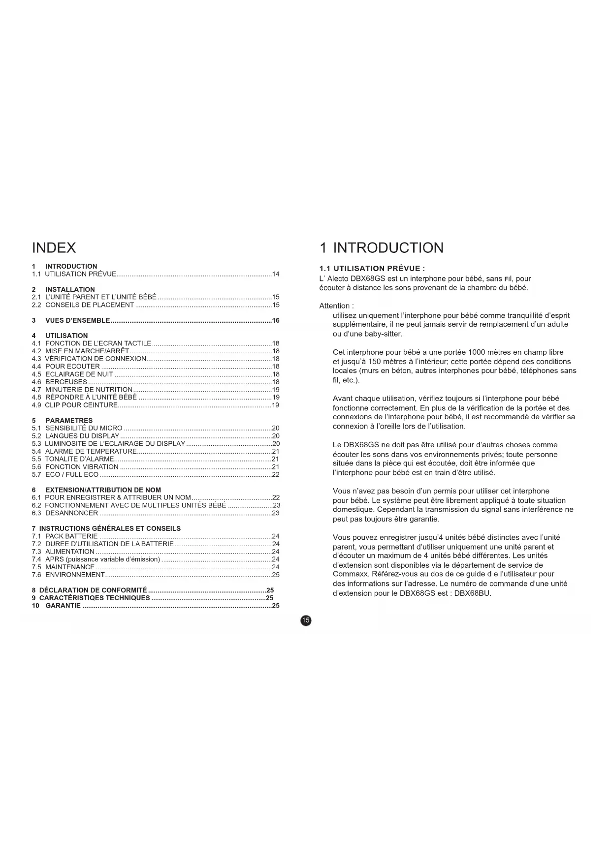 - Le Moniteur pour bébé convient pour une utilisation jusqu’à -15°C. Le DBX68GS n’est PAS étanche; vous devez le protéger contre l’humidité tout le temps.17