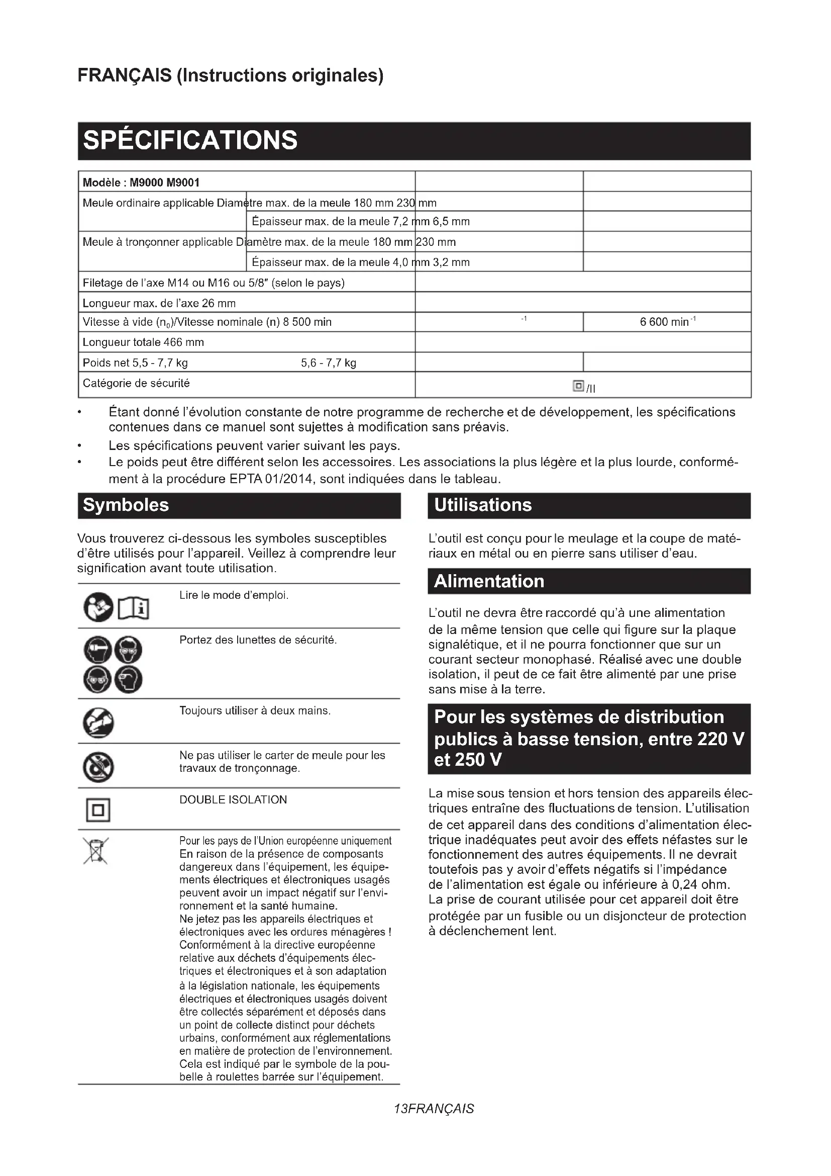 - Le poids peut être diérent selon les accessoires. Les associations la plus légère et la plus lourde, conformé- ment à la procédure EPTA 01/2014, sont indiquées dans le tableau. Symboles Vous trouverez ci-dessous les symboles susceptibles d’être utilisés pour l’appareil. Veillez à comprendre leur signication avant toute utilisation. Lire le mode d’emploi. Portez des lunettes de sécurité. Toujours utiliser à deux mains. Ne pas utiliser le carter de meule pour les travaux de tronçonnage. DOUBLE ISOLATION Pour les pays de l’Union européenne uniquement En raison de la présence de composants dangereux dans l’équipement, les équipe- ments électriques et électroniques usagés peuvent avoir un impact négatif sur l’envi- ronnement et la santé humaine. Ne jetez pas les appareils électriques et électroniques avec les ordures ménagères ! Conformément à la directive européenne relative aux déchets d’équipements élec- triques et électroniques et à son adaptation à la législation nationale, les équipements électriques et électroniques usagés doivent être collectés séparément et déposés dans un point de collecte distinct pour déchets urbains, conformément aux réglementations en matière de protection de l’environnement. Cela est indiqué par le symbole de la pou- belle à roulettes barrée sur l’équipement. Utilisations L’outil est conçu pour le meulage et la coupe de maté- riaux en métal ou en pierre sans utiliser d’eau. Alimentation L’outil ne devra être raccordé qu’à une alimentation de la même tension que celle qui gure sur la plaque signalétique, et il ne pourra fonctionner que sur un courant secteur monophasé. Réalisé avec une double isolation, il peut de ce fait être alimenté par une prise sans mise à la terre. Pour les systèmes de distribution publics à basse tension, entre 220 V et 250 V La mise sous tension et hors tension des appareils élec- triques entraîne des uctuations de tension. L’utilisation de cet appareil dans des conditions d’alimentation élec- trique inadéquates peut avoir des eets néfastes sur le fonctionnement des autres équipements. Il ne devrait toutefois pas y avoir d’eets négatifs si l’impédance de l’alimentation est égale ou inférieure à 0,24 ohm. La prise de courant utilisée pour cet appareil doit être protégée par un fusible ou un disjoncteur de protection à déclenchement lent.14 FRANÇAIS Bruit Niveau de bruit pondéré A typique, déterminé selon EN62841-2-3 : Modèle Niveau de pression sonore (L