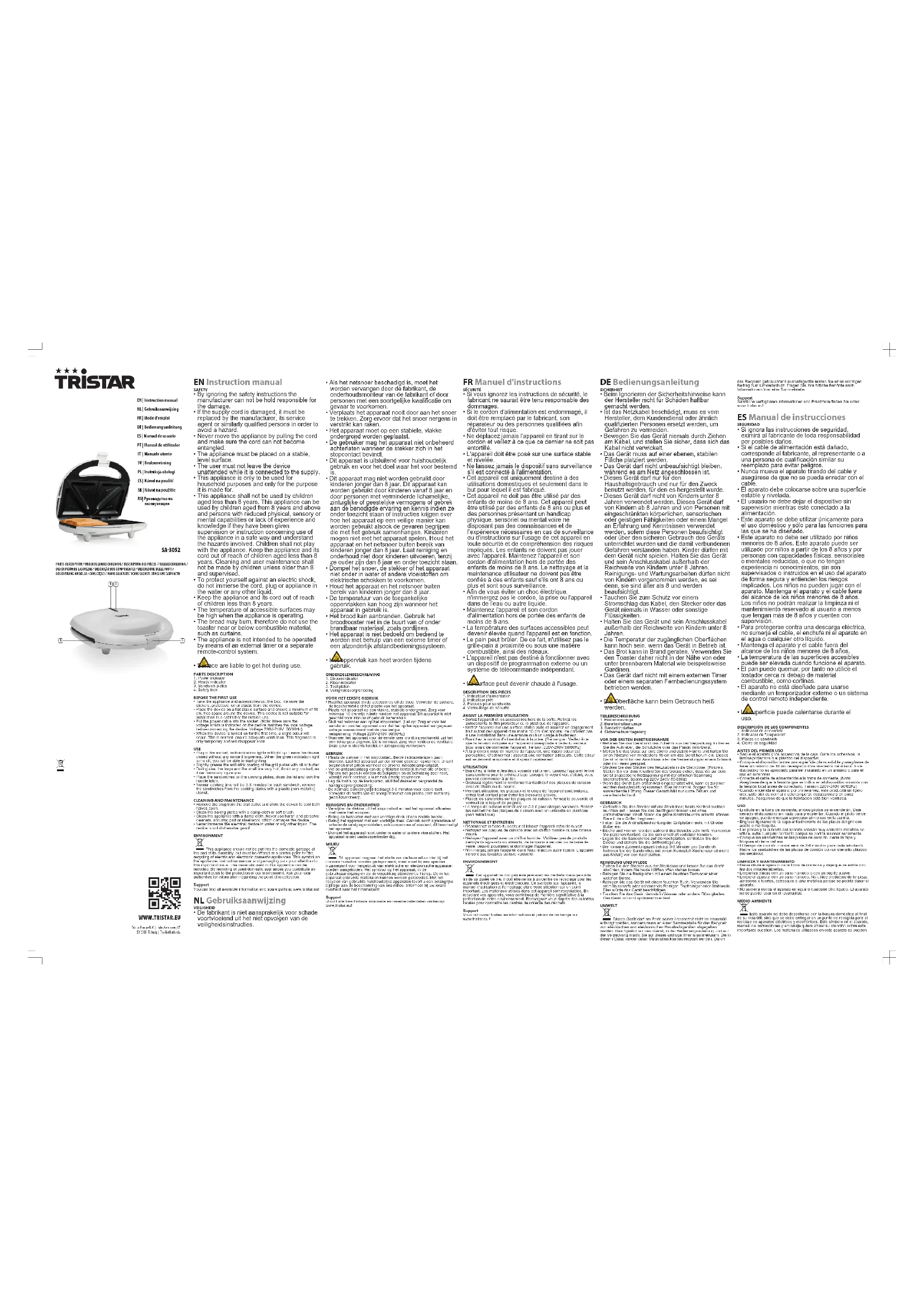 - La surface peut devenir chaude à l'usage. DESCRIPTION DES PIÈCES1. Indicateur d'alimentation2. Indicateur prêt3. Plaques pour sandwichs4. Verrouillage de sécuritéAVANT LA PREMIÈRE UTILISATION• Sortez l'appareil et les accessoires hors de la boîte.Retirez lesautocollants, le film protecteur ou le plastique de l'appareil.• Mettez l'appareil sur une surface stable plate et assurez un dégagementtout autour de l'appareil d'au moins 10 cm. Cet appareil ne convient pasà une installation dans une armoire ou à un usage à l'extérieur.• Branchez le cordon d’alimentation à la prise.(Remarque: Veillez à ceque la tension indiquée sur l’appareil corresponde à celle du secteurlocal avant de connecter l'appareil.Tension220V-240V 50/60Hz)• À la première mise en marche de l'appareil, une légère odeur estperceptible. C'est normal : assurez une ventilation adéquate. Cette odeurest seulement temporaire et disparaît rapidement.UTILISATION• Branchez la fiche et les deux voyants s'allument. Laissez l'appareil fermésans contenu pour le préchauffage. Lorsque le voyant vert s'éteint, vouspouvez commencer à griller.• Graissez légèrement le revêtement antiadhésif des plaques de cuissonavec de l’huile ou du beurre.• Pendant utilisation, les plateaux et le corps de l’appareil sont brûlants,évitez tout contact pour éviter les blessures graves.• Placez les sandwichs sur les plaques de cuisson, fermez le couvercle etverrouillez le loquet de poignée.• Le temps de cuisson normal est de 3 à 6 pour chaque sandwich. Retirezles sandwichs des plaques de cuisson avec un ustensile en plastique(non métallique).NETTOYAGE ET ENTRETIEN• Débranchez la fiche du secteur et laissez l’appareil refroidir ouvert.• Nettoyez les plaques de cuisson avec un chiffon humide ou une brossedouce.• Nettoyez l'appareil avec un chiffon humide. N'utilisez pas de produitsnettoyants agressifs ou abrasifs, de tampons à récurer ou de laine deverre, ceux-ci pourraient endommager l'appareil.• N'immergez jamais l'appareil dans l'eau ni aucun autre liquide. L'appareilne sont pas lavables au lave-vaisselle.ENVIRONNEMENTCet appareil ne doit pas être jeté avec les déchets ménagers à lafin de sa durée de vie, il doit être remis à un centre de recyclage pour lesappareils électriques et électroniques. Ce symbole sur l'appareil, lemanuel d'utilisation et l'emballage attire votre attention sur un pointimportant. Les matériaux utilisés dans cet appareil sont recyclables. Enrecyclant vos appareils, vous contribuez de manière significative à laprotection de notre environnement. Renseignez-vous auprès des autoritéslocales pour connaître les centres de collecte des déchets.SupportVous retrouvez toutes les informations et pièces de rechange surwww.tristar.eu! DEBedienungsanleitung SICHERHEIT