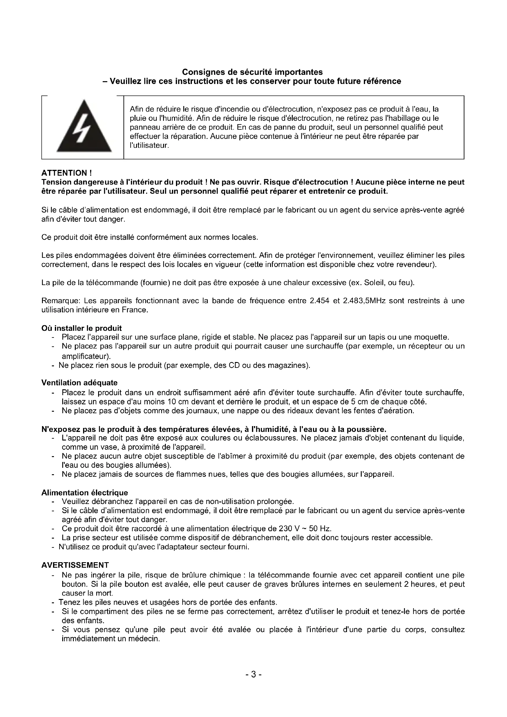 | Sécurité | Ne pas utiliser à proximité de l'eau, éviter les chocs électriques, débrancher l'appareil lors d'un orage. |