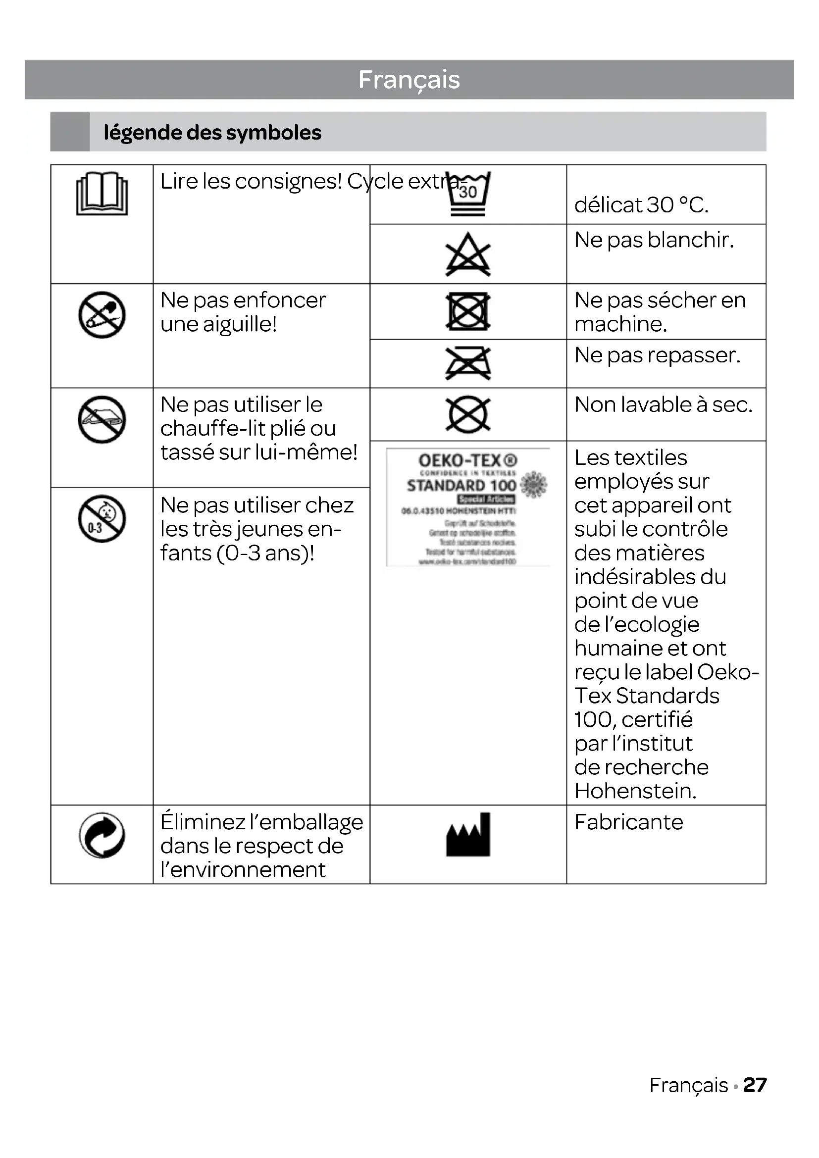 ![]() | Ne pas utiliser le chauffe-lit plié ou tassé sur lui-même! | ![]() | Non lavable à sec. |