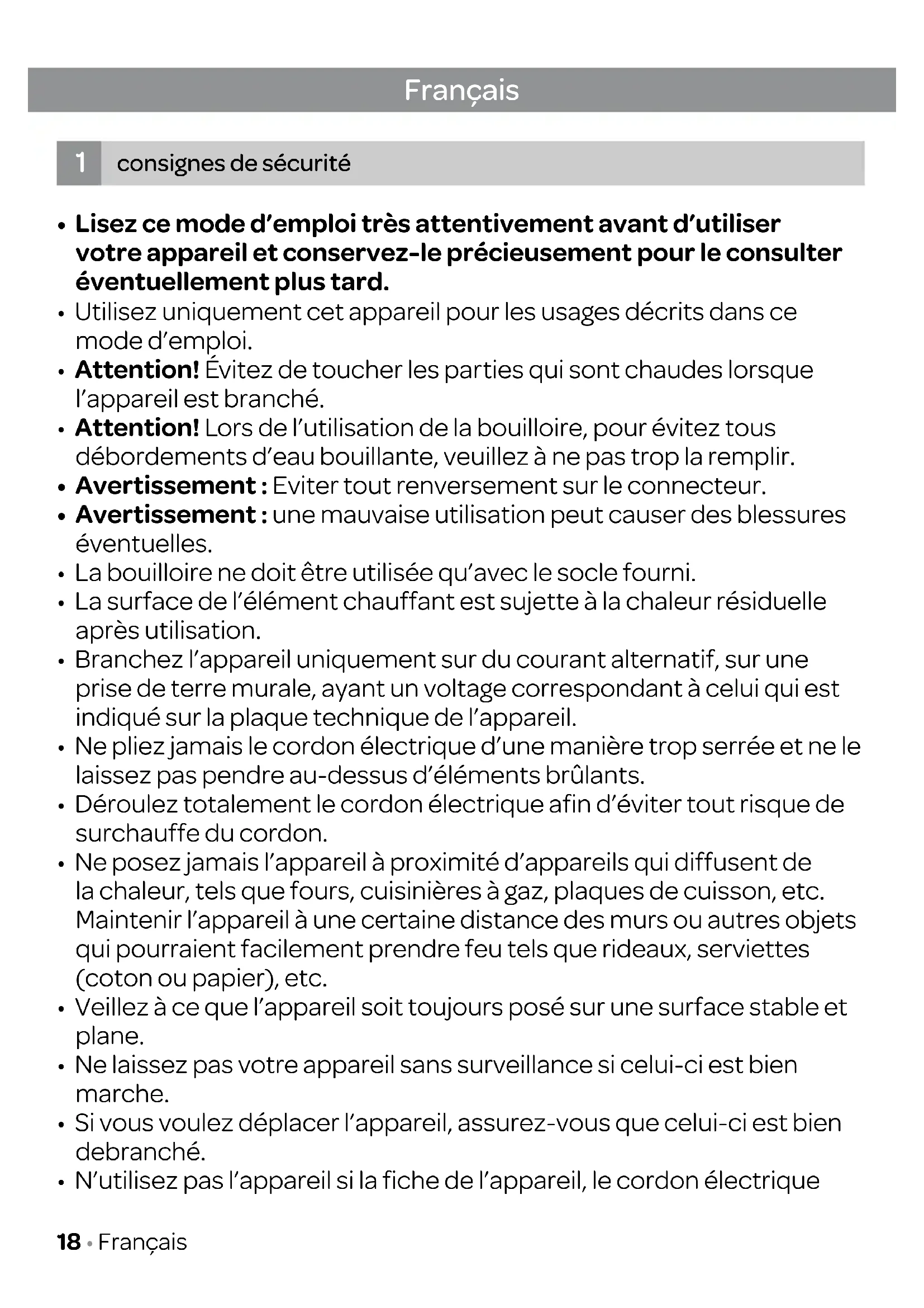 La bouilloire a eté concue uniquement pour faire bouillir de l'eau. Ne la replisssez jamais avec du lait, du thé ou du café, ni avec d'autres boissons instantanées.