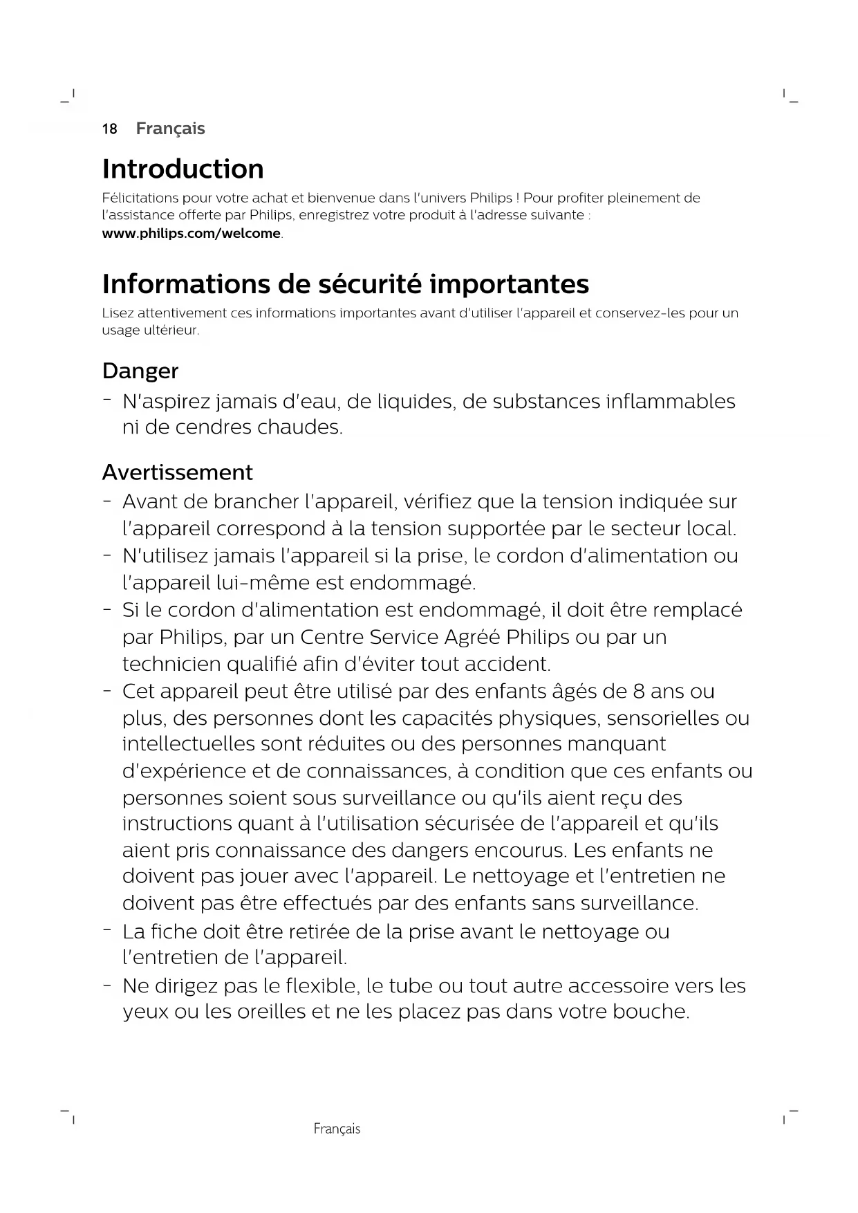 EspañolFrançais Introduction Félicitations pour votre achat et bienvenue dans l'univers Philips ! Pour profiter pleinement del'assistance offerte par Philips, enregistrez votre produit à l'adresse suivante :www.philips.com/welcome. Informations de sécurité importantes Lisez attentivement ces informations importantes avant d'utiliser l'appareil et conservez-les pour unusage ultérieur. Danger