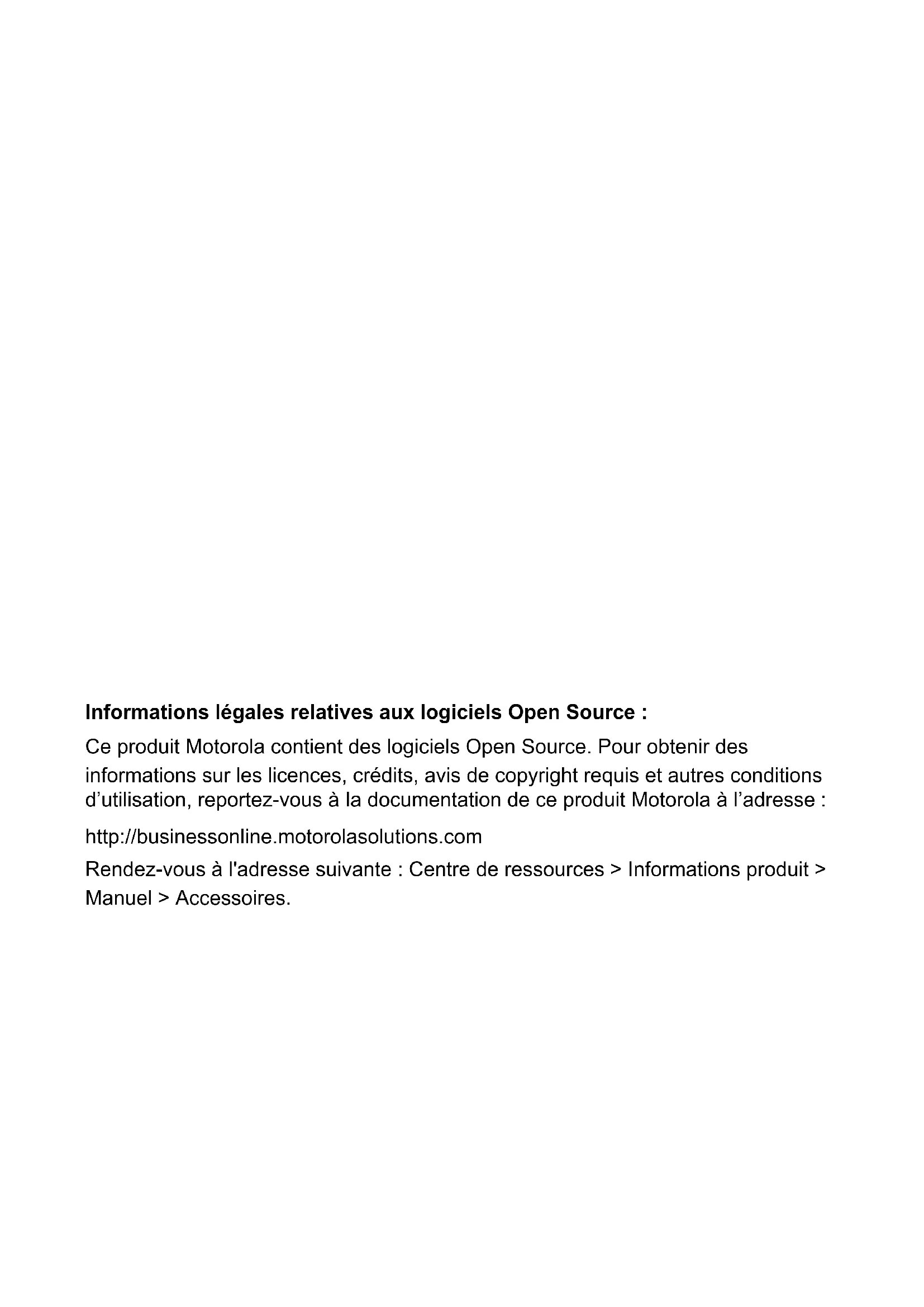 - ZUBEHÖR Hinweis MOTOROLA, MOTO, MOTOROLA SOLUTIONS und das stilisierte M-Logo sind Warenzeichen oder eingetragene Warenzeichen der Motorola Trademark Holdings, LLC und werden unter Lizenz verwendet. Alle anderen Marken sind das Eigentum ihrer jeweiligen Inhaber. © 2013 Motorola Solutions, Inc. Alle Rechte vorbehalten.Informations légales relatives aux logiciels Open Source : Ce produit Motorola contient des logiciels Open Source. Pour obtenir des informations sur les licences, crédits, avis de copyright requis et autres conditions d’utilisation, reportez-vous à la documentation de ce produit Motorola à l’adresse : http://businessonline.motorolasolutions.com Rendez-vous à l'adresse suivante : Centre de ressources > Informations produit > Manuel > Accessoires.1 SOMMAIRE Français SOMMAIRE Sommaire p. 1