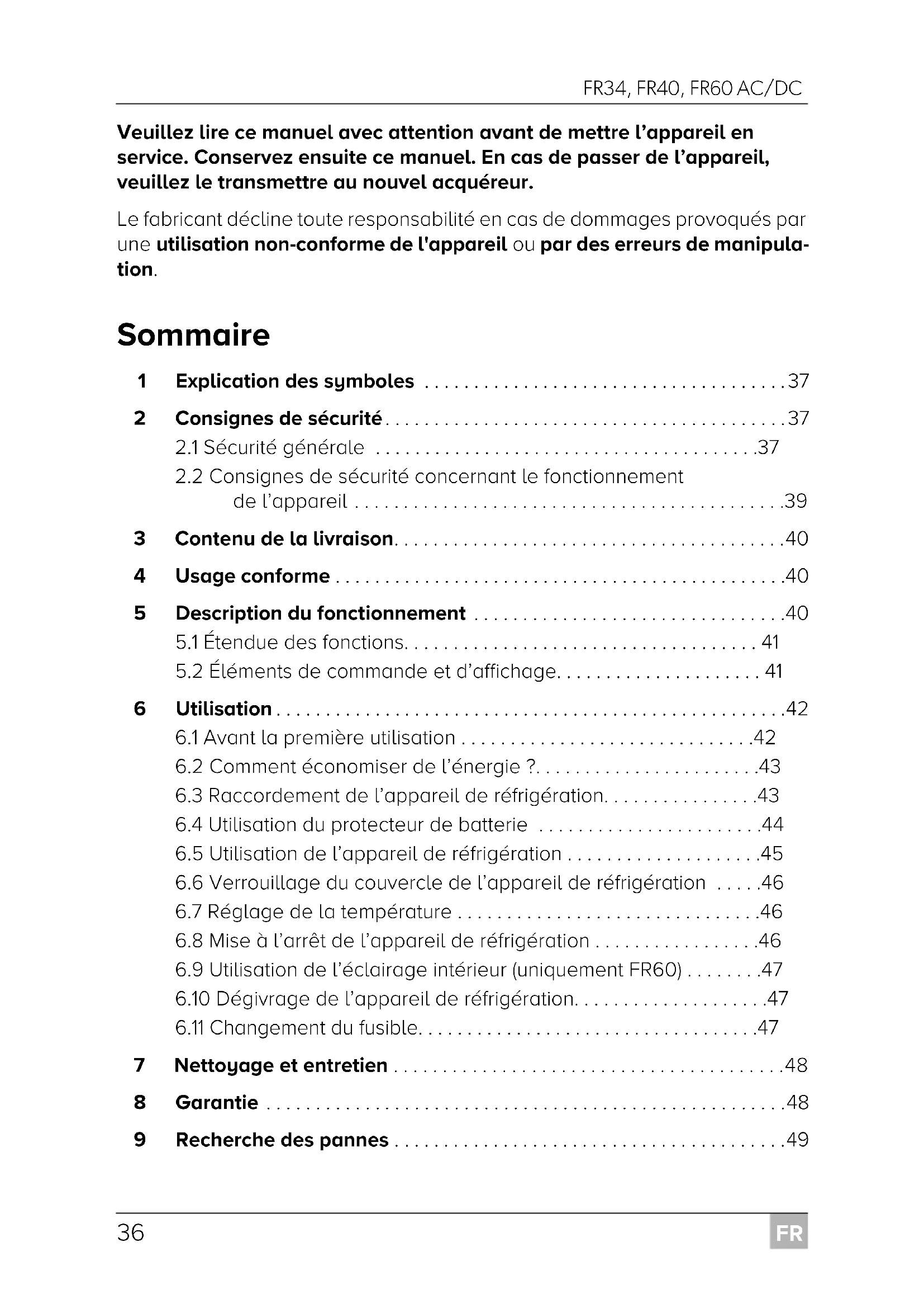 - Veuillez lire ce manuel avec attention avant de mettre l’appareil en service. Conservez ensuite ce manuel. En cas de passer de l’appareil, veuillez le transmettre au nouvel acquéreur. Le fabricant décline toute responsabilité en cas de dommages provoqués par une utilisation non-conforme de l'appareil ou par des erreurs de manipula- tion. Sommaire 1 Explication des symboles p. 37